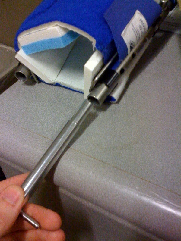I was distraught to see how messed up (and weak) my arm had become. Fortunately for me, help was on the way IN THE FORM OF TECHNOLOGY. My physical therapist hooked me up with a Dynasplint rental. A Dynasplint is basically a medieval torture device in which you crank down on some springs with a key which then forces your arm (or leg or jaw(?) etc) to stop misbehaving, and extend like normal.