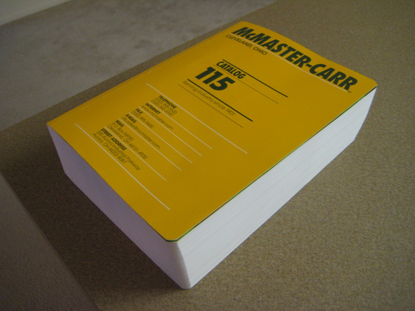 I bought and went through the entire print version of the McMaster-Carr catalog. 3824 pages. “Why the hell would you go through their entire catalog when they have such an amazingly-searchable-like-totally-better-than-even-Google website? Because you can’t be an as effective design engineer if you don’t have a basic knowledge of what’s out there and worth buying pre-fab’d, and what is worth designing on your own. I found quite a few things while going through the pages that I was not aware existed, or were just neat variations on things I did know existed, or which were just really awesome/impressive, even if I probably won’t ever end up using them. Many of the things I saw could come in handy to me in my engineering career, or in my tech related hobbies. I found about 90 items which I thought were neat enough to write down in my notebook, but I’ll just highlight a few of the coolest here (where “cool” is designed from the perspective of someone who is into machine design).
