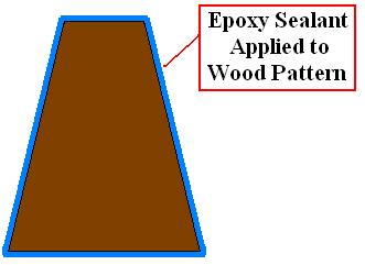 What can be used as a sealant?  Polyester or epoxy resins will work.  Obviously the thickness of a coat of epoxy, relative to the size of the pattern, is extremely thin.  Depending on the dimensional accuracy you want to achieve with your composite part, the thickness of that coat of epoxy sealant may or may not be accounted for when you are making your pattern.  I’ll represent the sealing of the theoretical “conical wood pattern” with a layer of theoretical “blue epoxy” whose thickness is severely exaggerated for the sake of illustration: