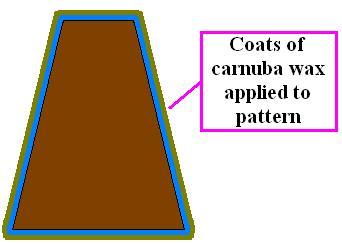 Step 3: after allowing the sealant to cure, a wax must be applied on top of the sealant.  The wax will help prevent the gel coat from adhering to the epoxy surface of the pattern.  A Carnuba-based wax must be used (silicon-based wax will not work since it will not allow the PVA coating to stick to it–explained in the next step).  Several well-polished coats of wax should be applied with clean toweling, with the last coat allowed to stand for 24 hours before applying gel coat, to allow the volatiles to evaporate.  We’ll say the theoretical “wax” is light-brownish in color: