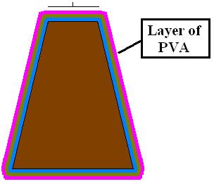Step 4: Apply PVA (polyvinyl alcohol) to the waxed pattern.  PVA is a mold-release agent which gel coat epoxy is incapable of adhering to (Jeff did tell me this when I was working with him, and hey, it’s on the internet, so it must be true).  It is also conveniently water soluble so it is easily washed off of the gel coat shell later with water.  Regarding its application to the waxed pattern, I’ll just quote directly from a website I mentioned earlier: “Best applied using a spray gun using high air pressure (80 to 100 PSI) and low output of liquid. Apply several thin coats followed by a heavier wet coat of approximately 2-4 mils [read with a wet mil gauge]. If spray equipment is not available, acceptable results can be obtained using a poly foam brush, lightly wetted with PVA, and a delicate one-way brush stroke. Allow PVA to dry at least 30 minutes or until tack-free and glossy.”  Our theoretical layer of “PVA” is pink: