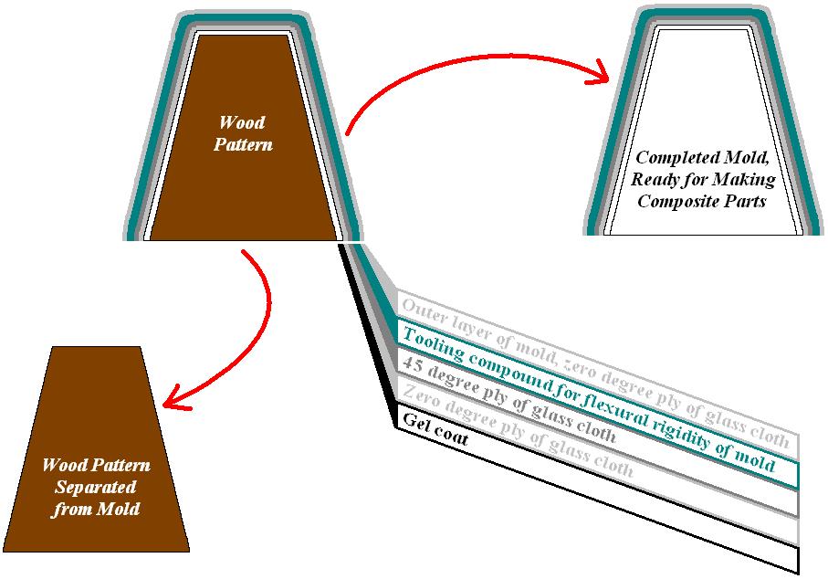 To assist in visualizing the work which was done in this first day to complete the mold, I’ll again employ the theoretical “conical part” which was used to illustrate the gel coat process earlier.  For clarity in this drawing, I won’t illustrate the layer of epoxy sealant, the coat of Carnuba wax, and the coat of PVA….  I’ll just show the gel coat adjacent to the pattern, as well as all the “reinforcement layers” which we applied while working today: