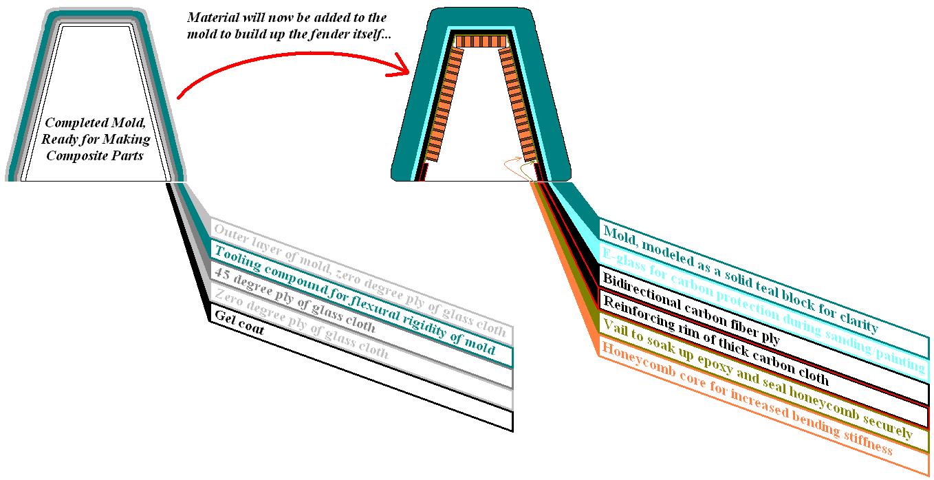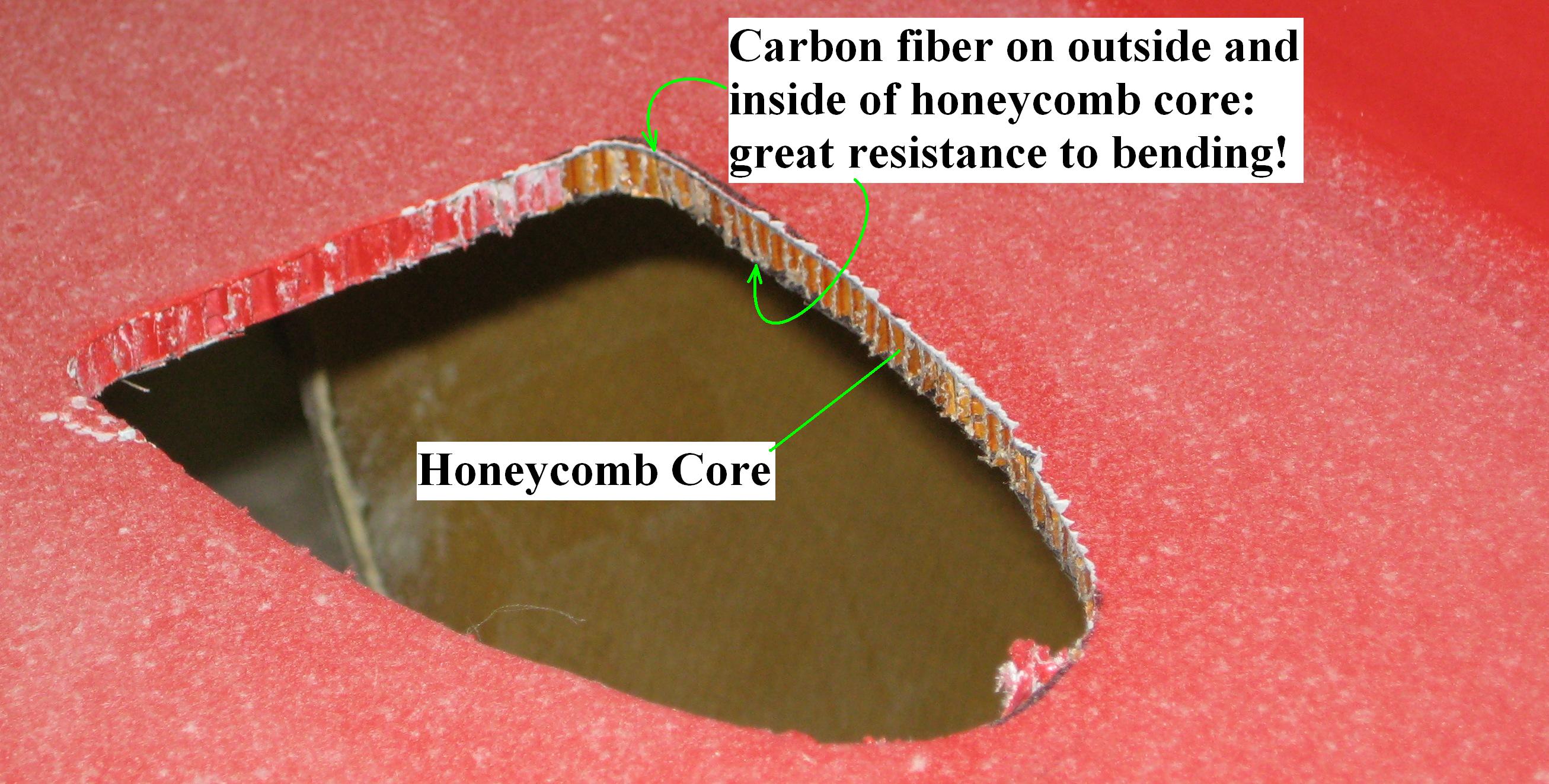 Honeycomb / foam core will be epoxied between two layers of carbon fiber in the fender layup process.  This is done for the same reason that the tooling compound was used in building the mold: by having the carbon fiber cloth placed far from the neutral axis, the fender will have much greater resistance to bending deflection (except honeycomb core is much lighter than tooling compound!).  Here is an example of this layup which I saw in a ducting hole from an older fender: