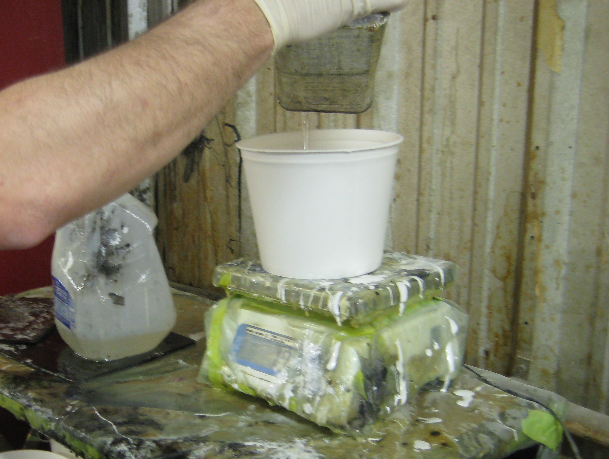 Once the two glass plies were fully wetted and smoothed out, the brushes are cleaned out by placing them in a bucket of acetone.  The next step is applying tooling compound to the mold.  Tooling compound (they used Adtech EL 323 tooling compound) is a two-part plastic (blue resin, yellow hardener–mixes to make a uniformly green compound).  Tooling compound gives the mold the rigidity it needs to stand up to the abuse of demolding many composite parts from it.  It also exploits the bending moment equation familiar to engineers: Stress = (Moment)*(distance from neutral axis)/(Second Moment of Area)…  By placing the glass fiber sheets on the outside surfaces of the tooling compound, the strength of the glass fibers is placed farthest from the cross section’s centroid–for the strongest potential mold.  As mentioned, tooling compound is a two-part mix: