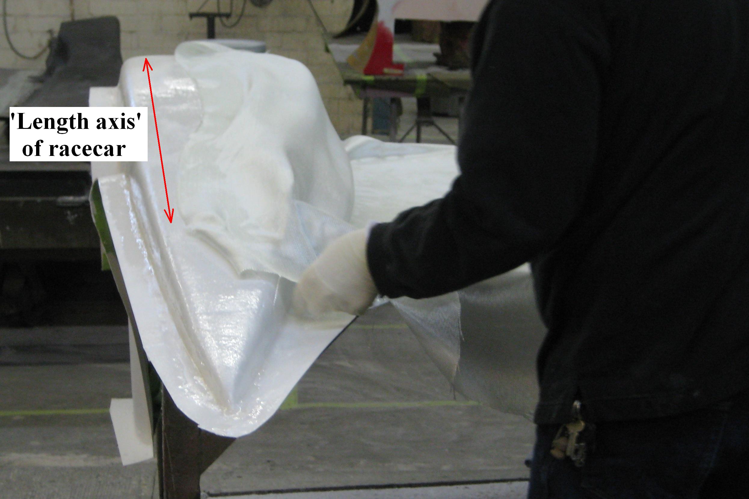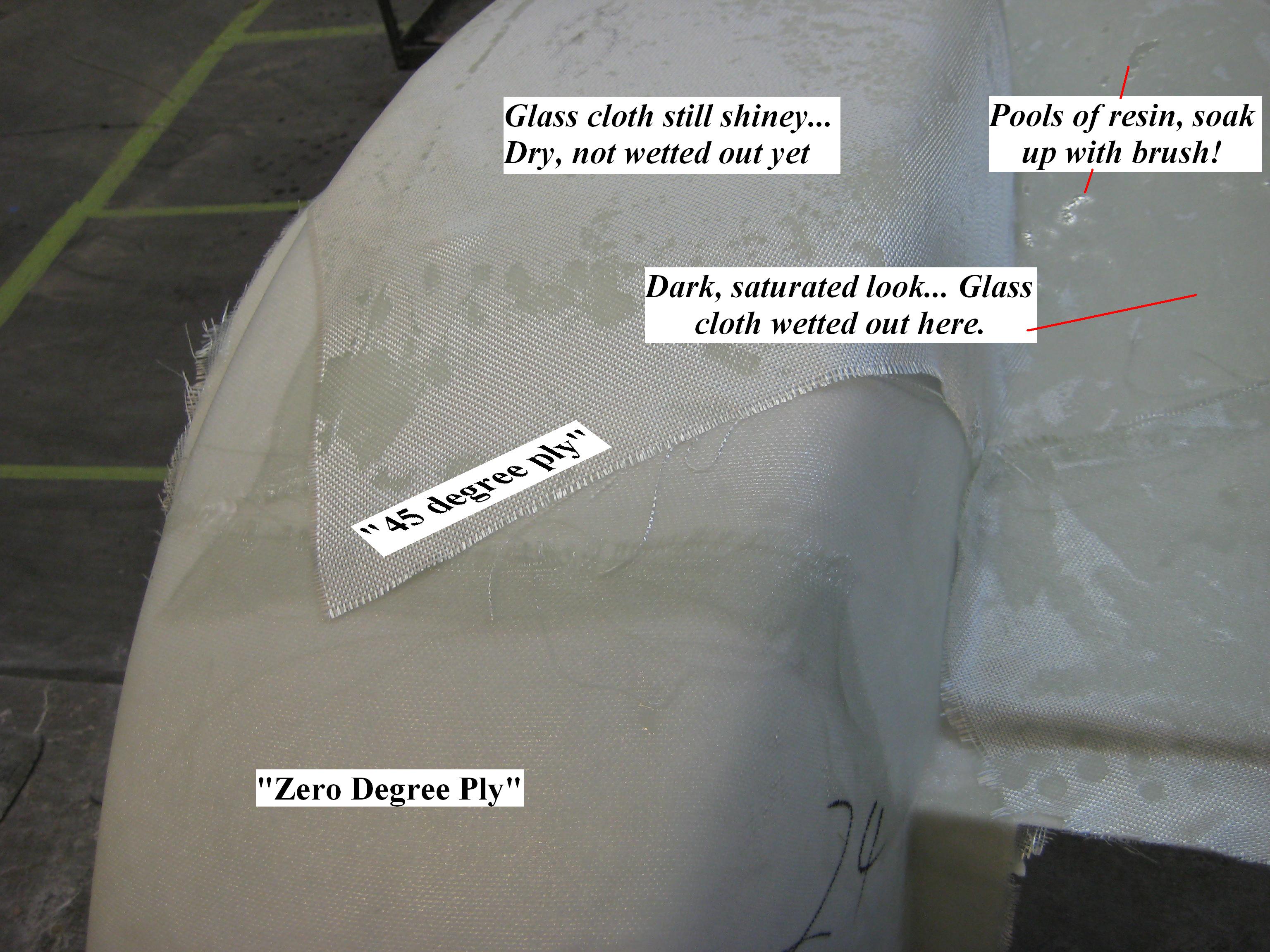 If the cloth is hanging off of the edges of the gel coat shell, it is trimmed off.  These smaller pieces are used to cover the small areas of the form which were not able to be covered with the large pieces of cloth.  For complicated areas, such as the fender wheelwell ‘arm’–the thin piece running down behind the wheel–very small excess pieces of cloth can be used to build up the glass in that area…  The goal is to completely cover the surface with a ply which, roughly, has one of the fiber axes oriented at ‘zero degrees.’  Then, the paintbrushes are used to lightly dab and press the cloth down onto the gelcoat, ensuring a good ‘wet out’–meaning the glass cloth has fully absorbed the epoxy (this is visually evident, the glass cloth goes from having a white shiney appearance to a darker, wet saturated look–refer to the following image).  A back-and-forth painting motion with the brush is NOT used because this can pull the weave of the fibers out of alignment.  Next a “45 degree ply” is laid up on top of the “zero degree ply”: