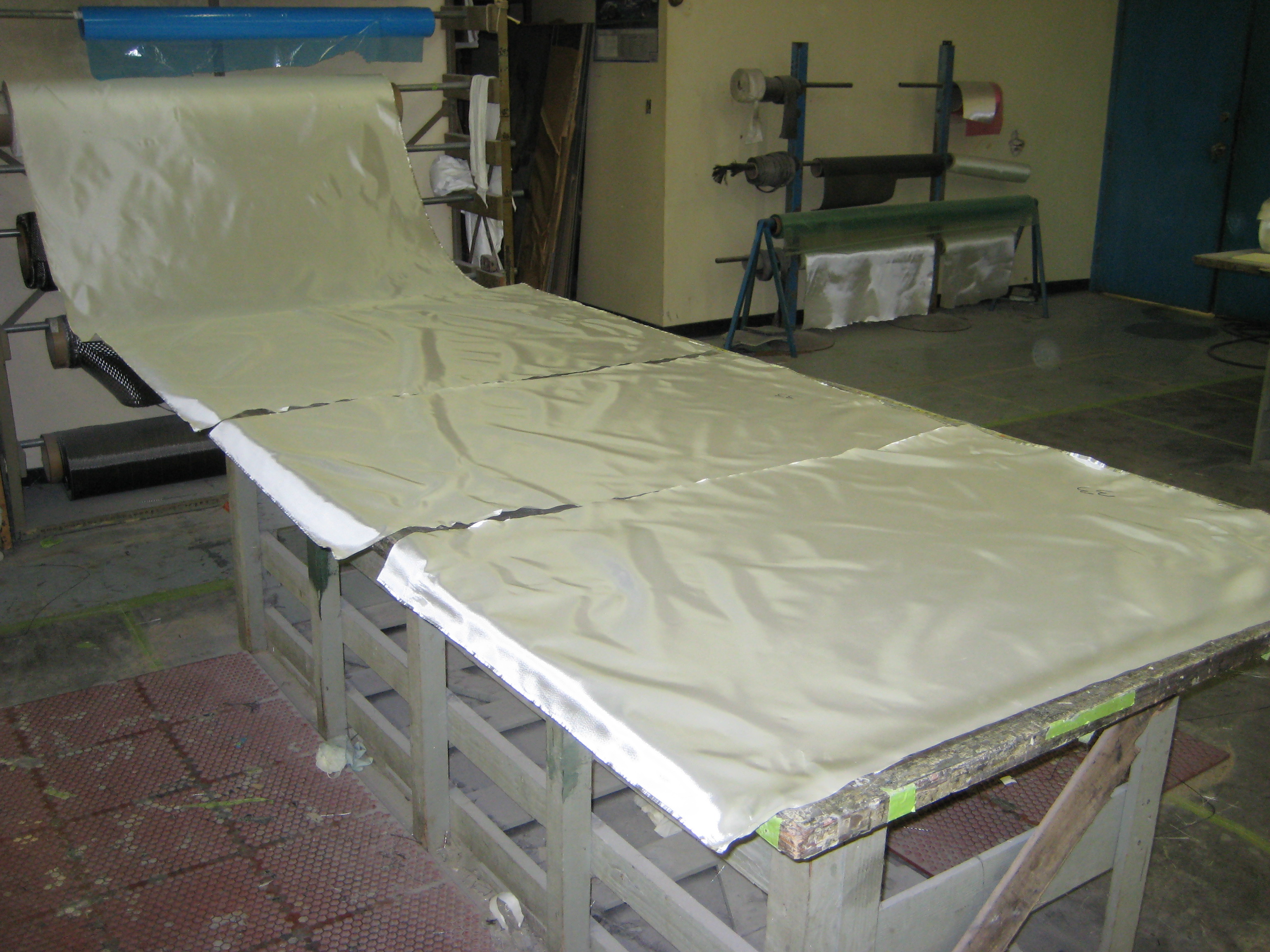 The next step in creating a vacuum bag is laying up the blue perf sheet (tabs of tape are used to hold the perf sheet and bleeder sheet in place):
