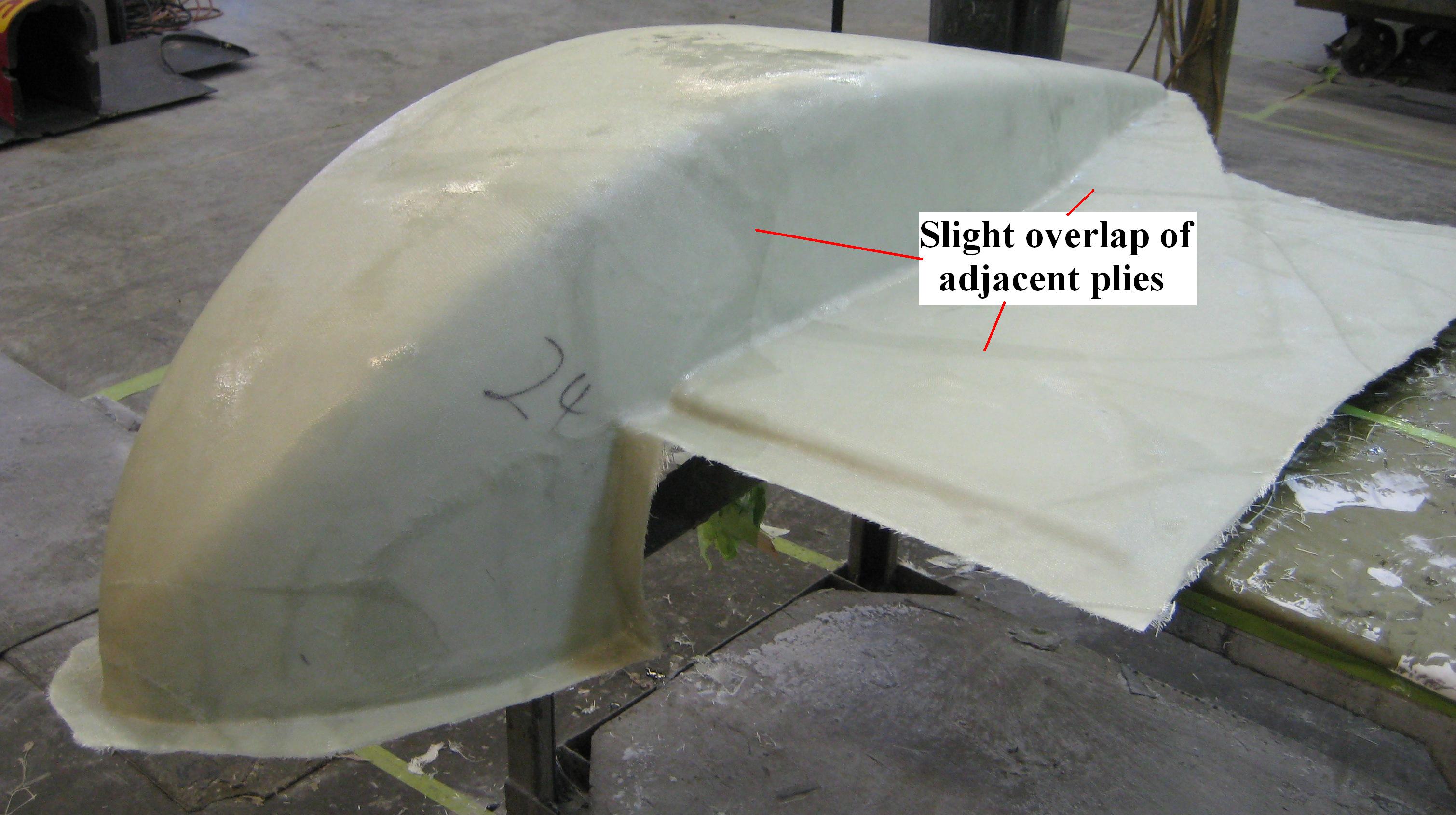 When arranging the different portions of cloth relative to each other, they should be laid down so that they overlap each other by a few inches to provide continuous glass coverage for that ply…  If adjacent pieces of cloth are laid up so that their edges abut each other perfectly, then a weak line in the ply will be created.  It is better to have them slightly overlap: