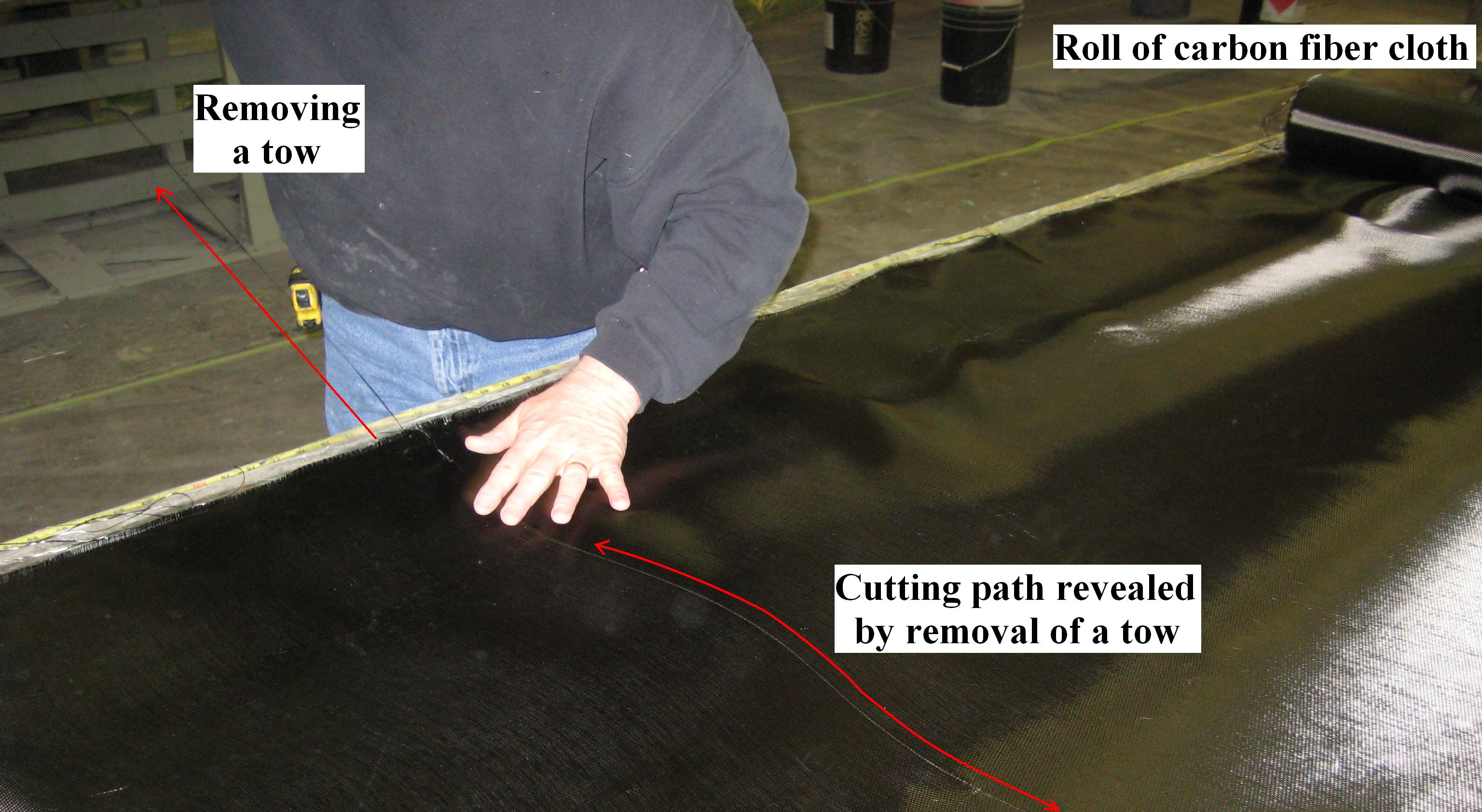 Just as in the first day I worked at Downing Composites, the first order of business is cutting up and setting out all the material which will be needed for the day.  Today, the vacuum bagging process would be done twice, and thus a lot more material would need to be cut up during preparation.  Carbon fiber was first cut to length and again, Rabbit had experience with this size part before, so he had records telling him what sizes of cloth to cut up.  A neat trick which Rabbit showed me is, after having measured to where you want to cut across the carbon fiber cloth, you pull a single tow out of the weave (‘tow’ is another word for a strand of the “yarn” of carbon fiber–carbon fibers are incredibly small in diameter, and are grouped together into larger strands called ‘tows’ for weaving into the bidirectional carbon fiber cloth we are working with here)….  Removing one of the tows reveals a line that is straight across the cloth, relative to the weave.  Because the bidirectional weave is easily pulled out of alignment, if you just cut a straight line across the cloth without following the weave, you will end up severing many fibers, mid-strand, which are spanning the cloth.  This will weaken the edges of your cloth and your composite part.  Here is a picture of the carbon cloth with a single tow removed to guide the cutting process: