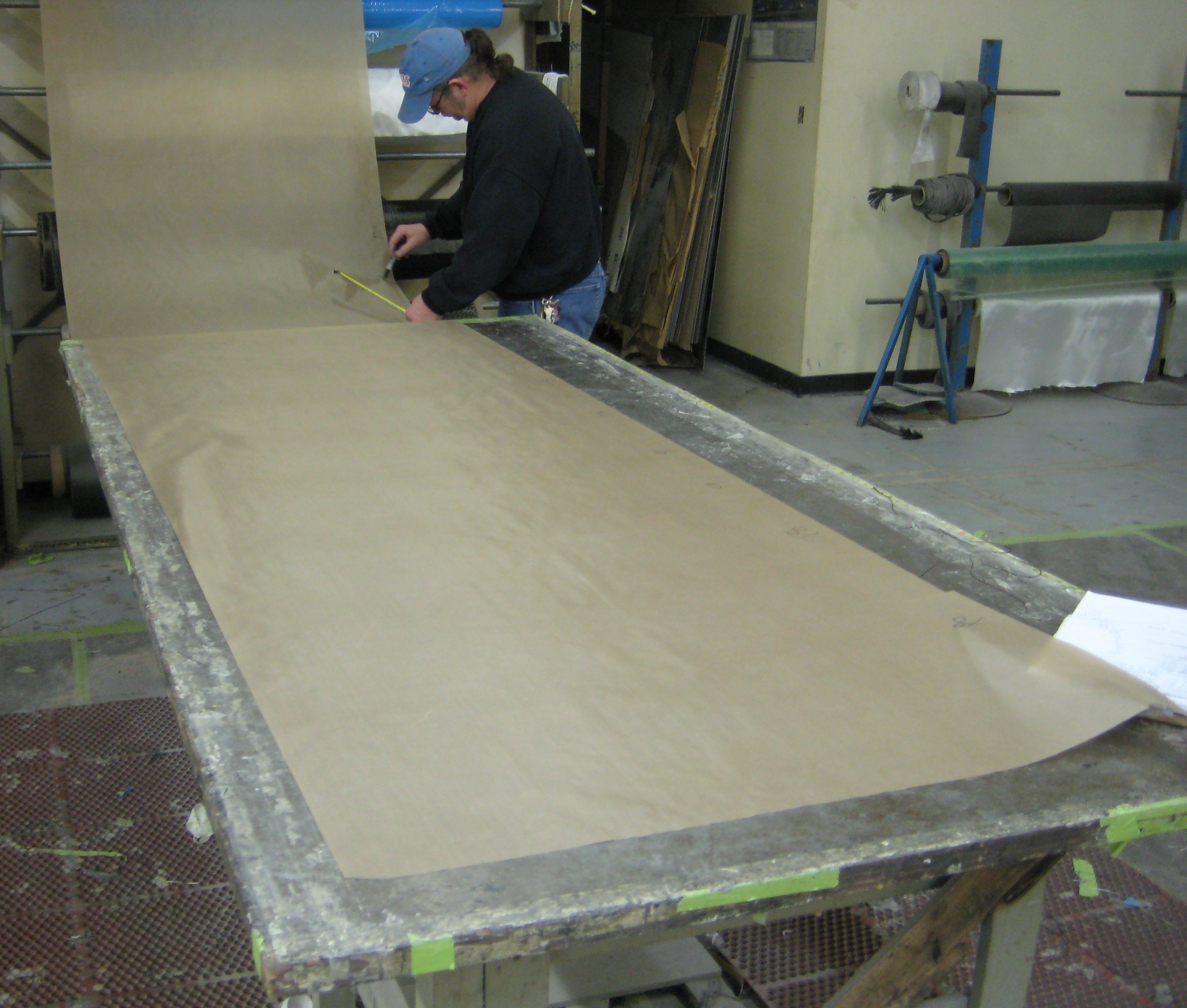 First, fiberglass cloth pieces had to be cut from a roll of glass cloth.  They had rolls of material on a rack next to a cloth-cutting table with a measuring tape tacked to it.  Experience with building molds of this size allowed Rabbit to quickly cut out appropriately sized pieces of fiberglass cloth (they used coarse weave bidirectional fiberglass cloth to do this–sorry, didn’t get the specifications for it).  Rabbit had a notebook with cloth size measurements in it which would be sufficient for covering the surface of the fender shell.  Here’s the cloth cutting table and rolls of material: