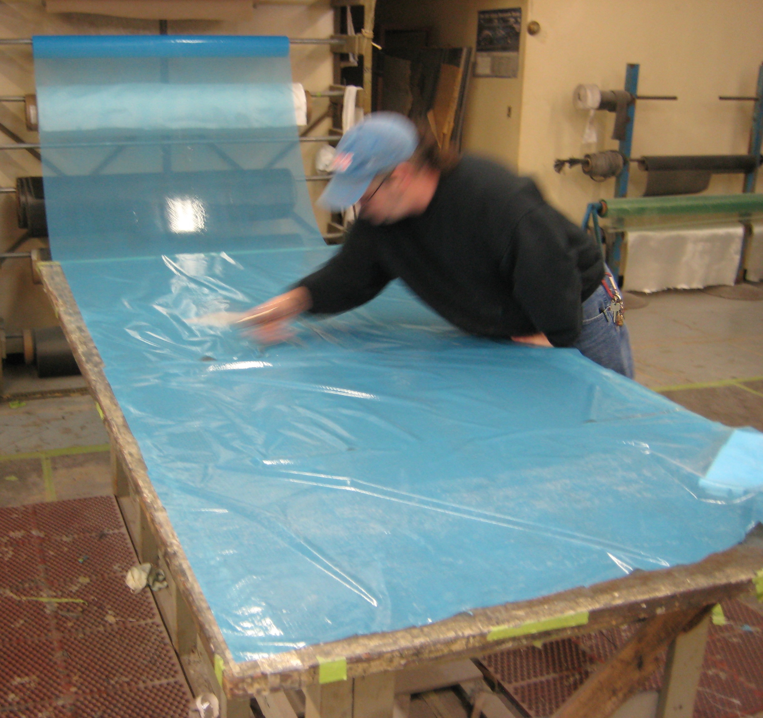 Perf (‘perforated’) sheet is also cut to length.  Perf sheet is a blue plastic film which has regularly spaced holes in it.  These holes allow resin to be sucked from the wetted out carbon fiber cloth, through the peel-ply, through the perf sheet itself, where it is then trapped in the bleeder sheet.  Perf sheet: