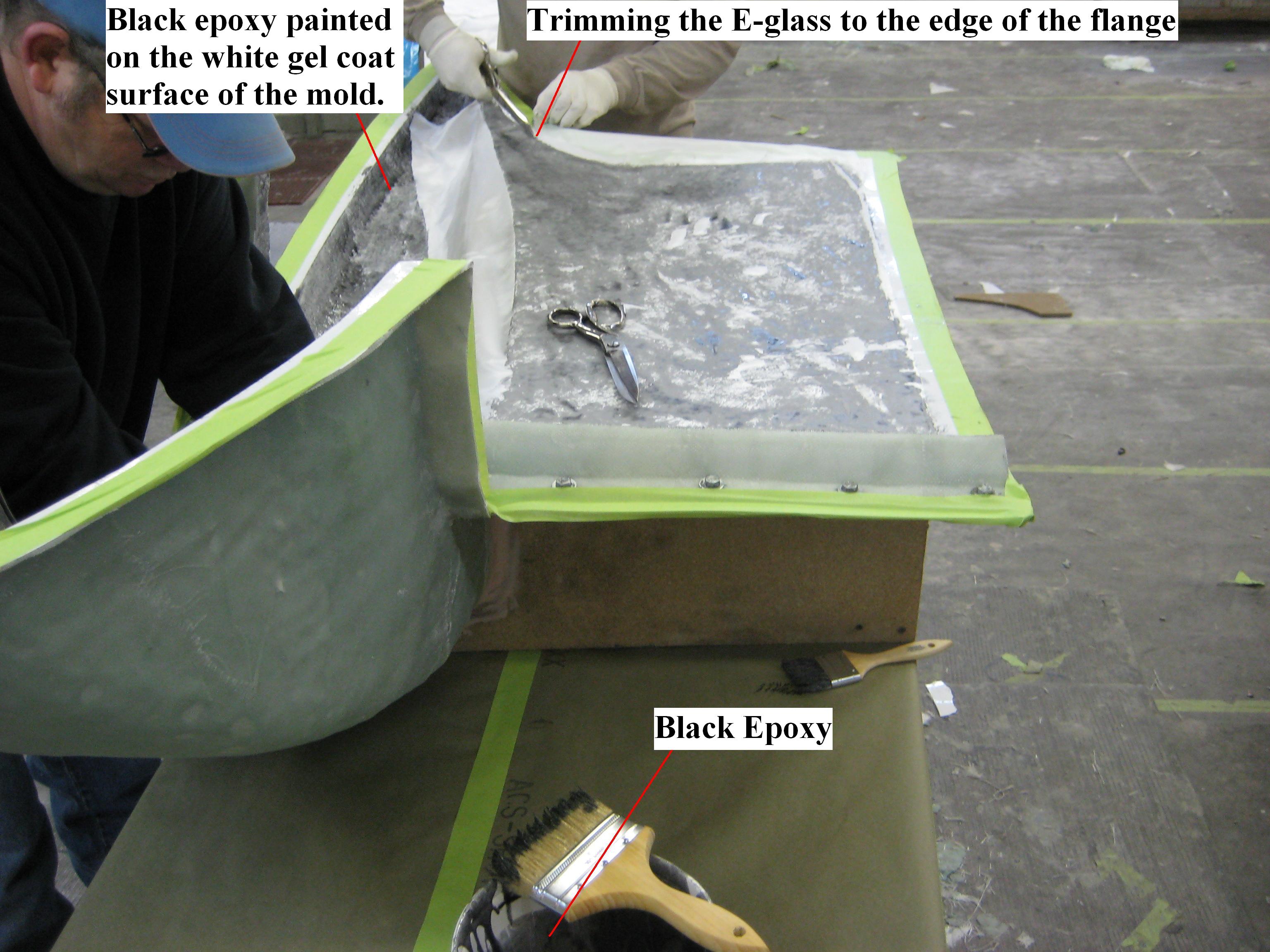 After the E-glass is thoroughly wetted out, the first layer of carbon fiber is laid out on top of the E-glass.  It too is wetted out with the black epoxy and it is trimmed to size, so that the green tape on the flanges is still exposed (this rim of green tape ensures that room will be left on the flange for the sticky tack seal which must be placed on the flange to form the vacuum bag seal):