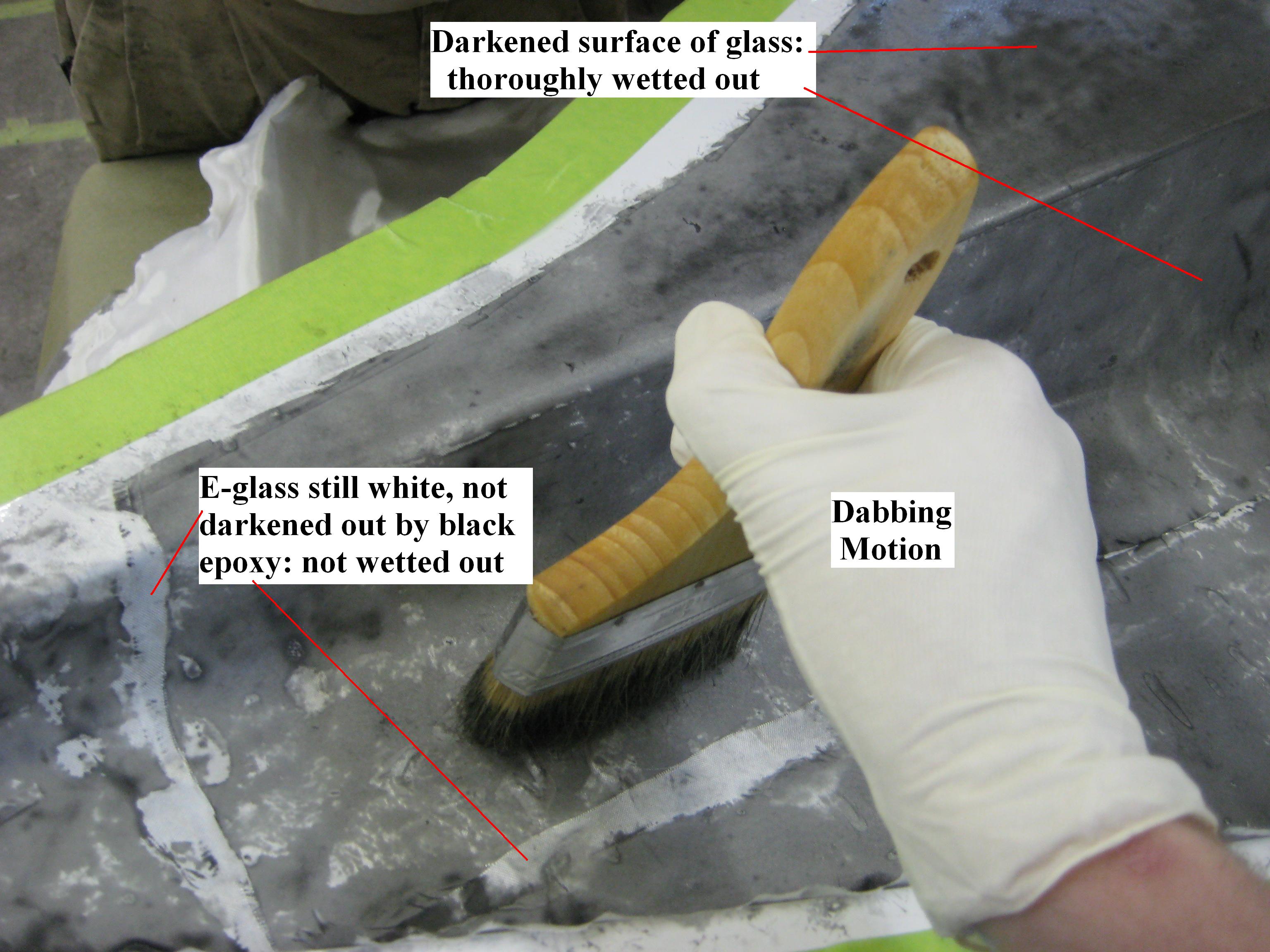 Just like before, a dabbing motion must be used to wet out the cloth with epoxy; this will prevent the fibers from being pulled out of alignment in the bidirectional weave: