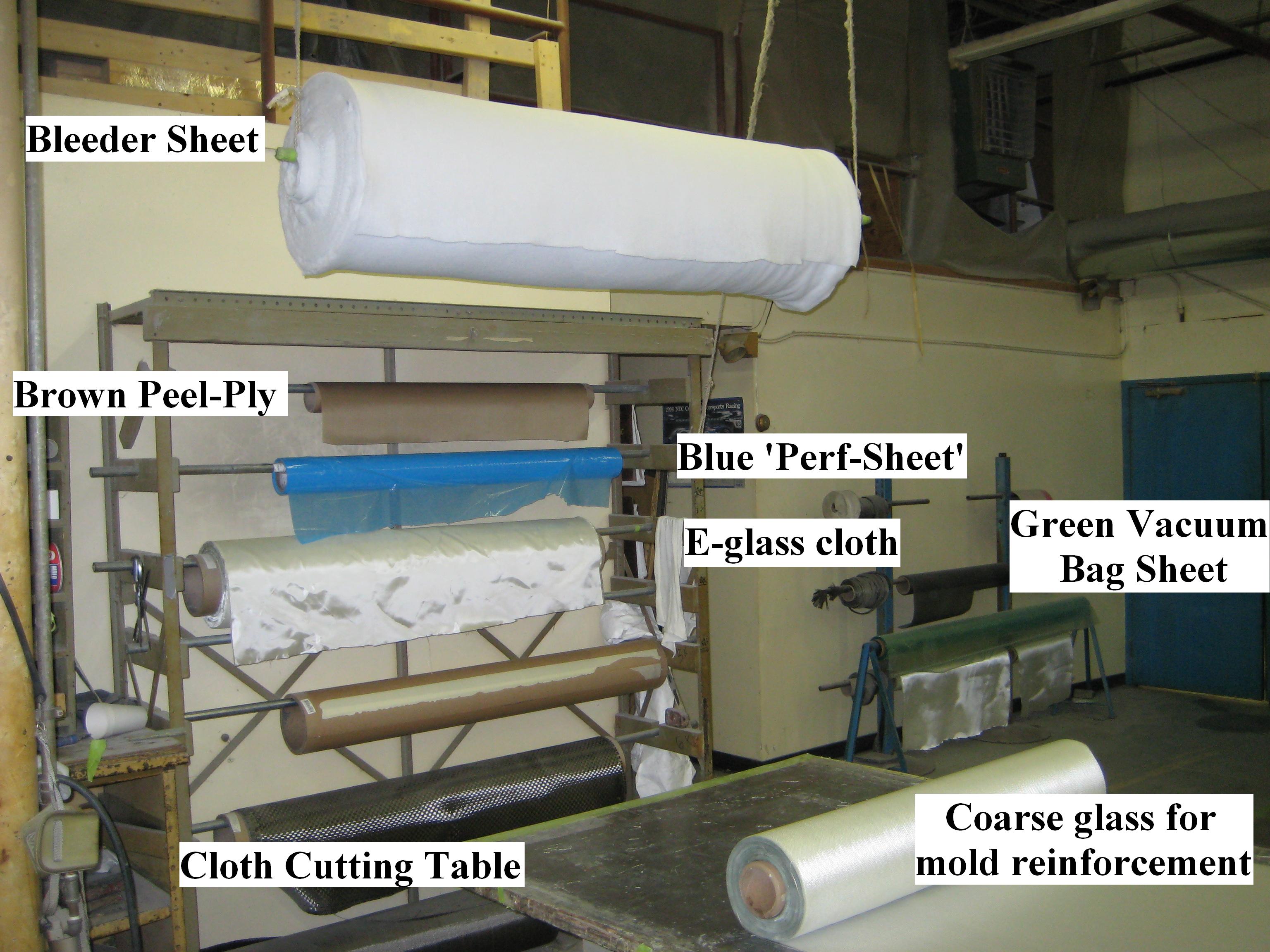 E-glass is actually going to be applied to the mold first in order to form the outer layer of the racecar fender (“think inside out and backwards”).  E-glass is used as the surface layer because the fender will be sanded and painted later.  The sanding process may damage the outermost ply, and rather than risk sanding into the carbon fiber by laying it up as the outermost layer, one ply of E-glass is put down to serve as a protective barrier.  E-glass cloth cut to appropriate lengths: