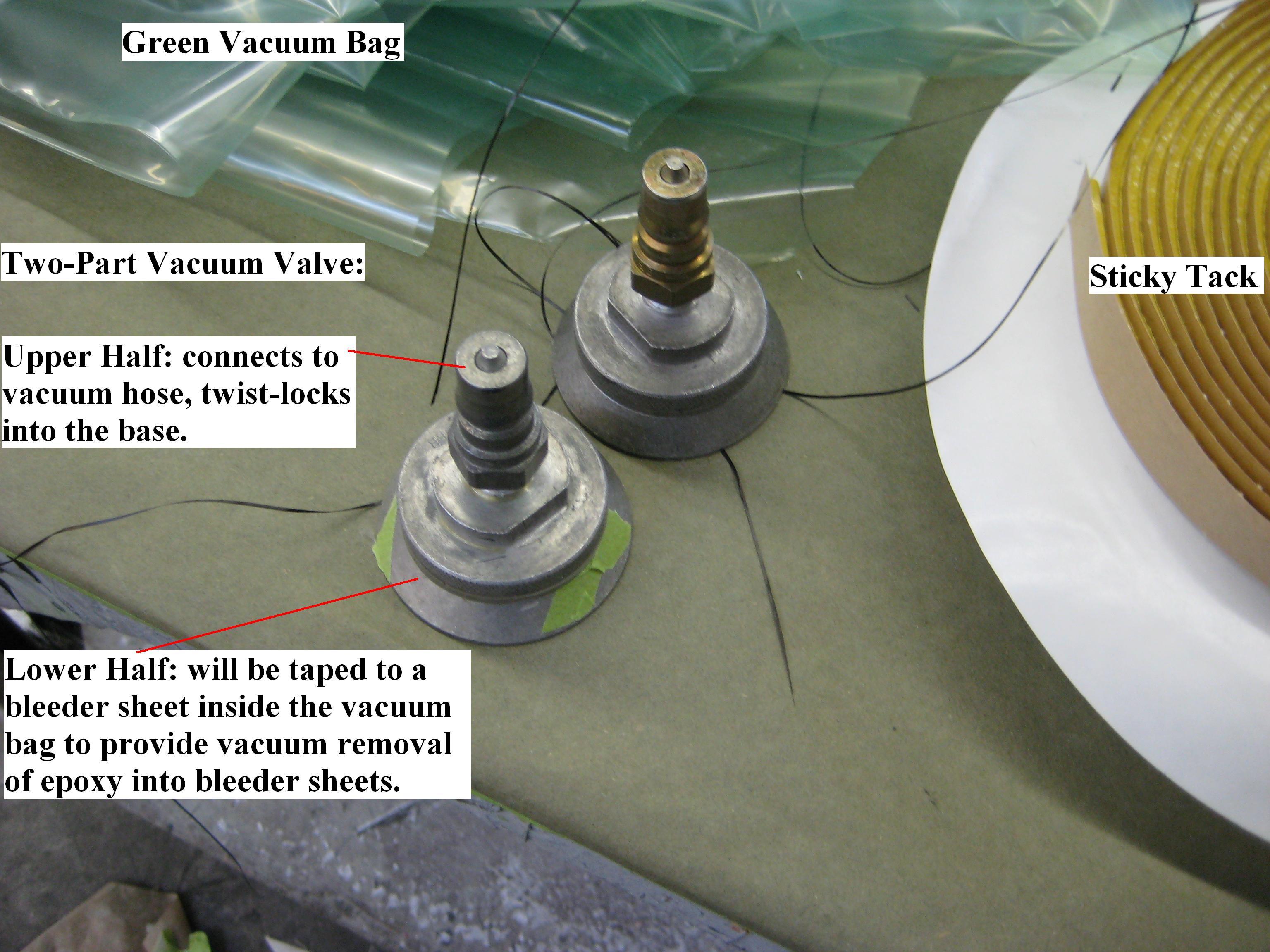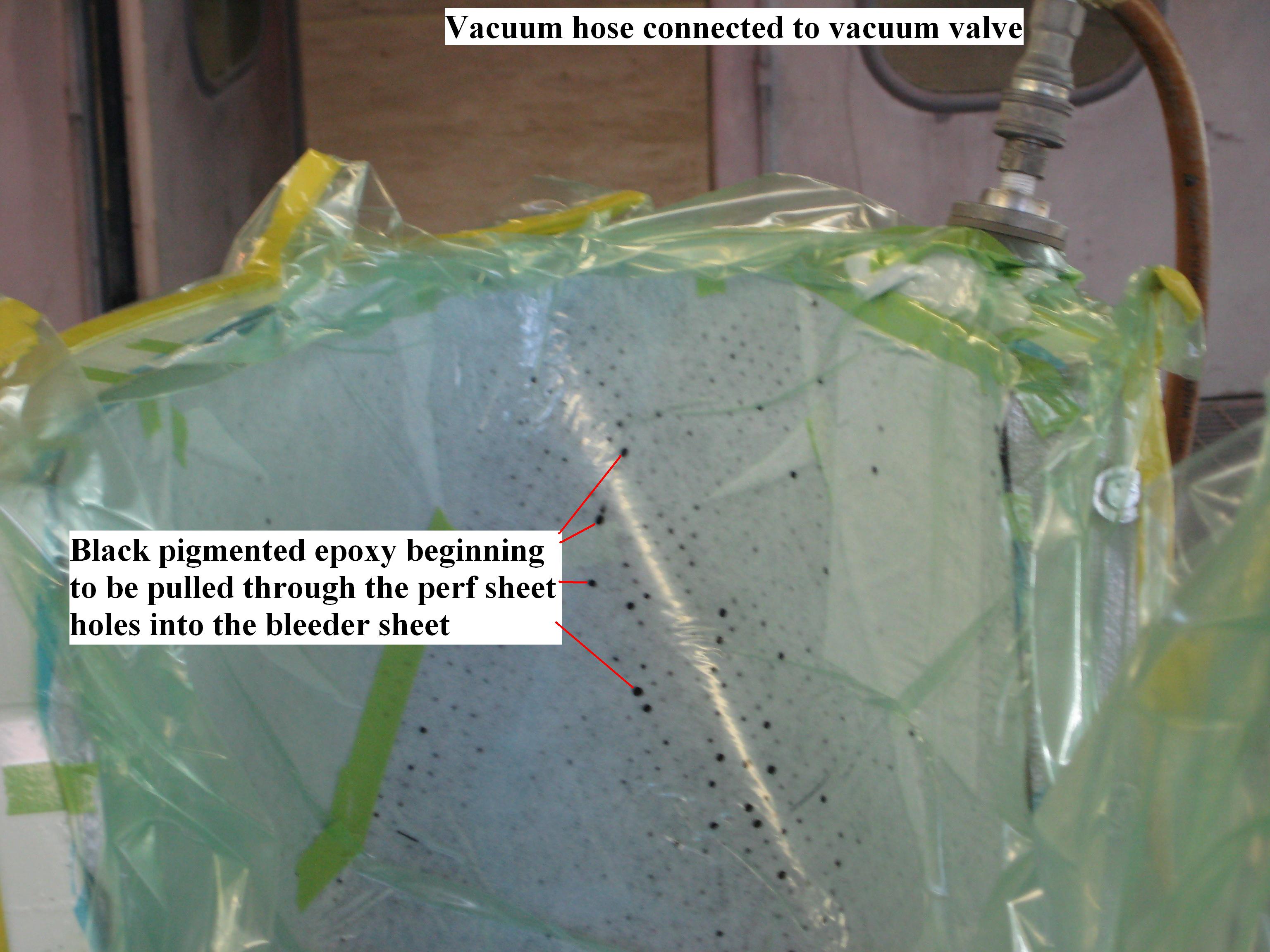 Next, the part is vacuum bagged again, with some minor modifications of the bagging process done already; discrepancies between the two processes are listed here and pictured below: