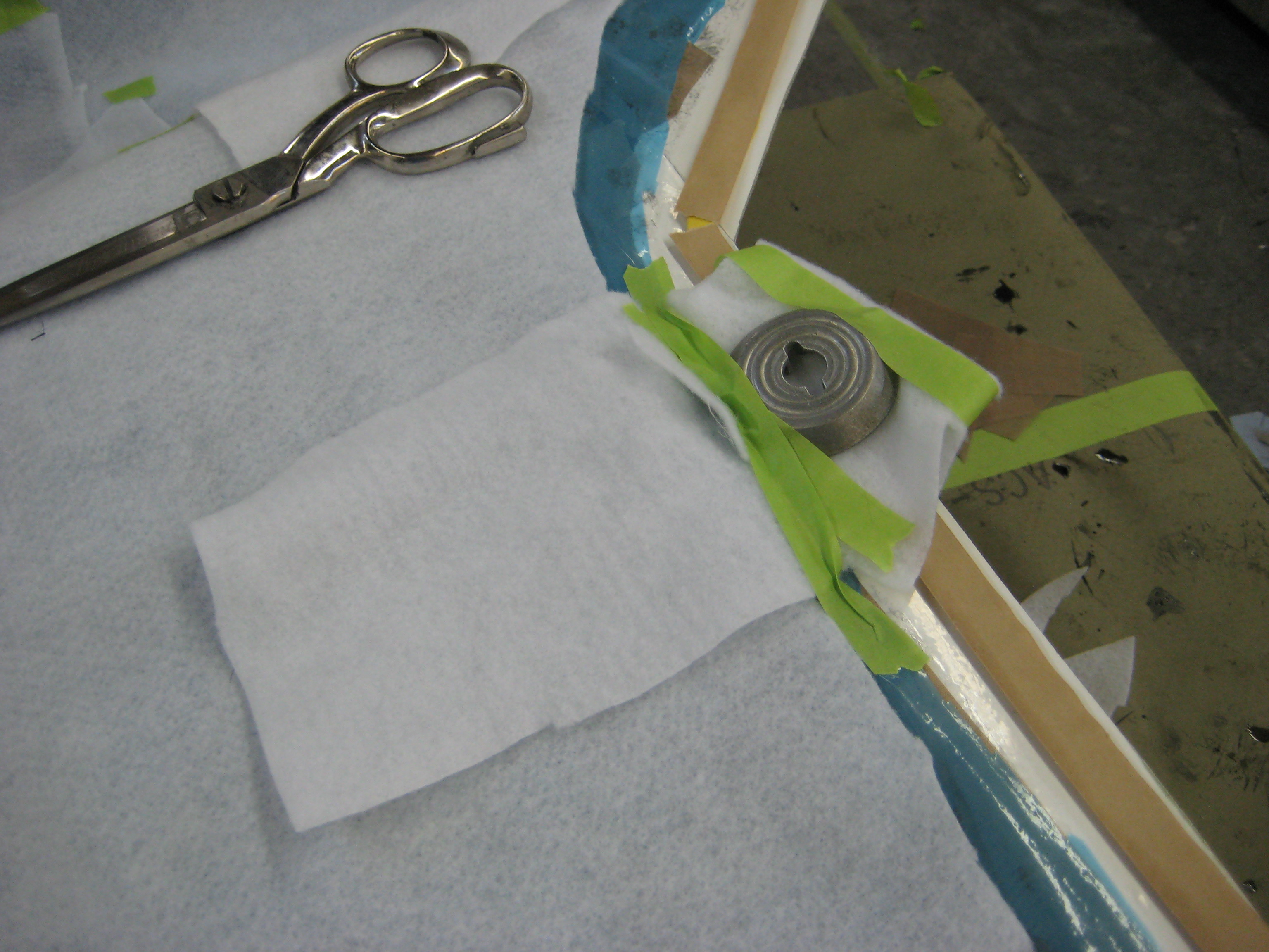 Two vacuum valve bases are affixed to folded pieces of bleeder sheet with tape and then taped down on ‘opposite ends’ of the fender.  One of these is shown here: