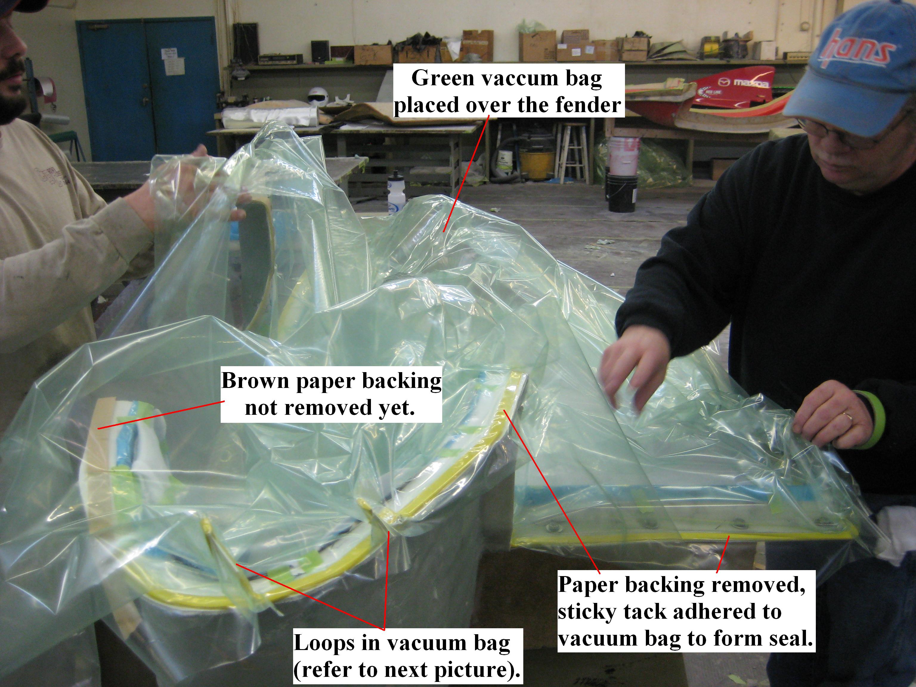 Now, the green vacuum bag sheet is brought over and set over the fender.  The sheet has to be pressed down to fill in the wheelwell cavity, and care must be taken to not puncture the bag.  Don’t unnecessarily crease the bag.  Then, the brown paper backing of the sticky tack can be removed and the bag can be pressed to the sticky tack to form a seal, this is shown here: