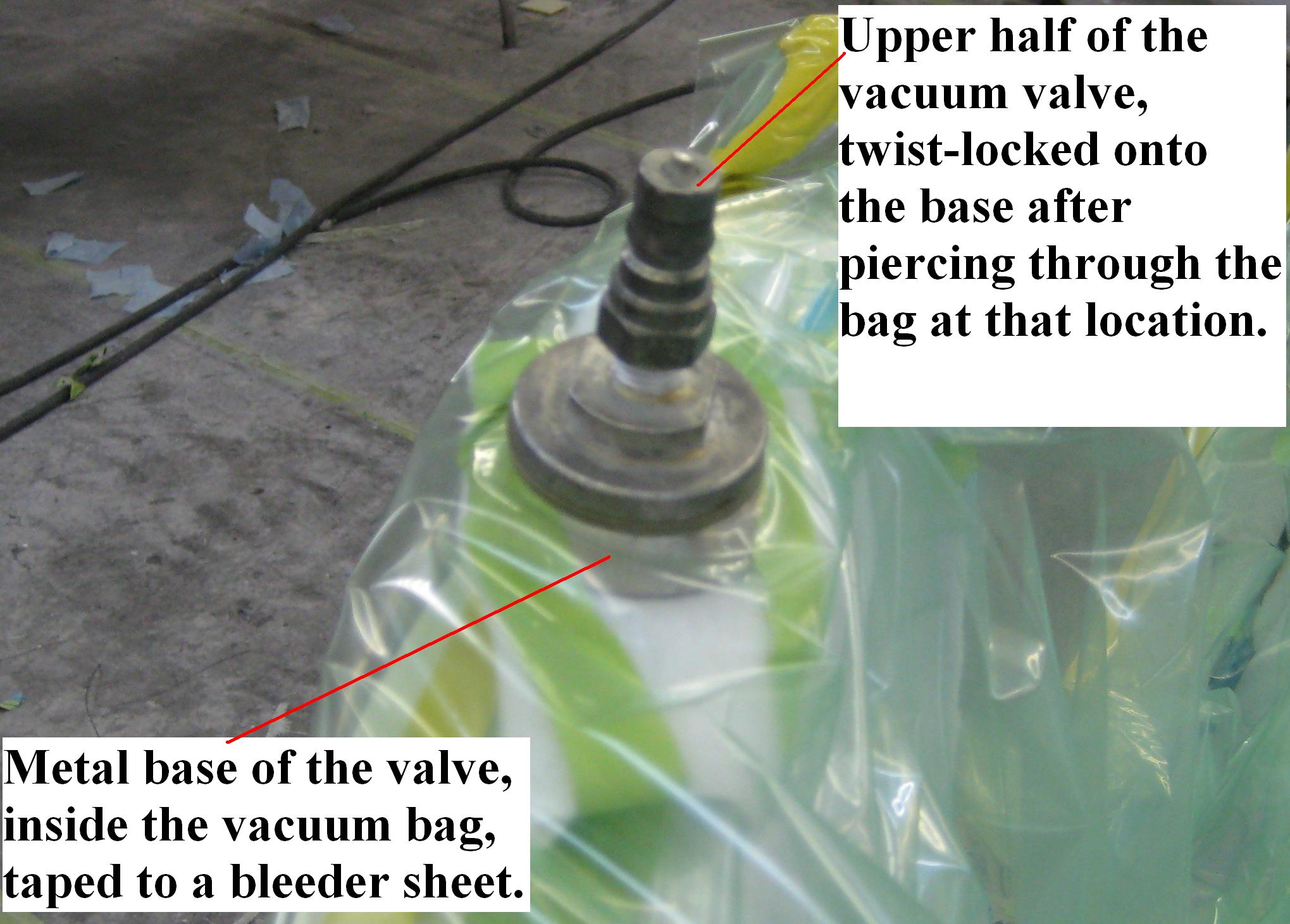 Now, the vacuum bag must be pierced near where the metal base of the vacuum valve is located inside the vacuum bag.  The upper half of the vacuum valve must be twist-locked onto the base to form a seal through the bag, with the valve base: