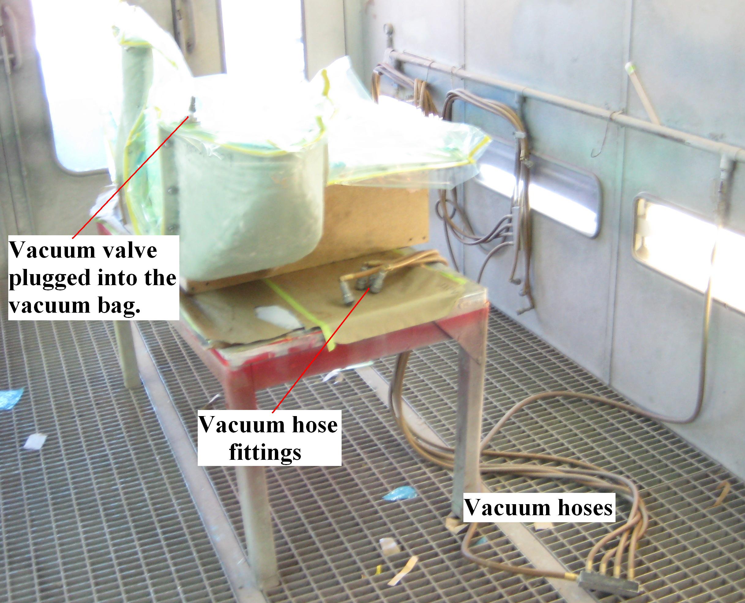 The mold and layup is set on a table in the heating room and the hoses are readied for plugging into the vacuum valves:
