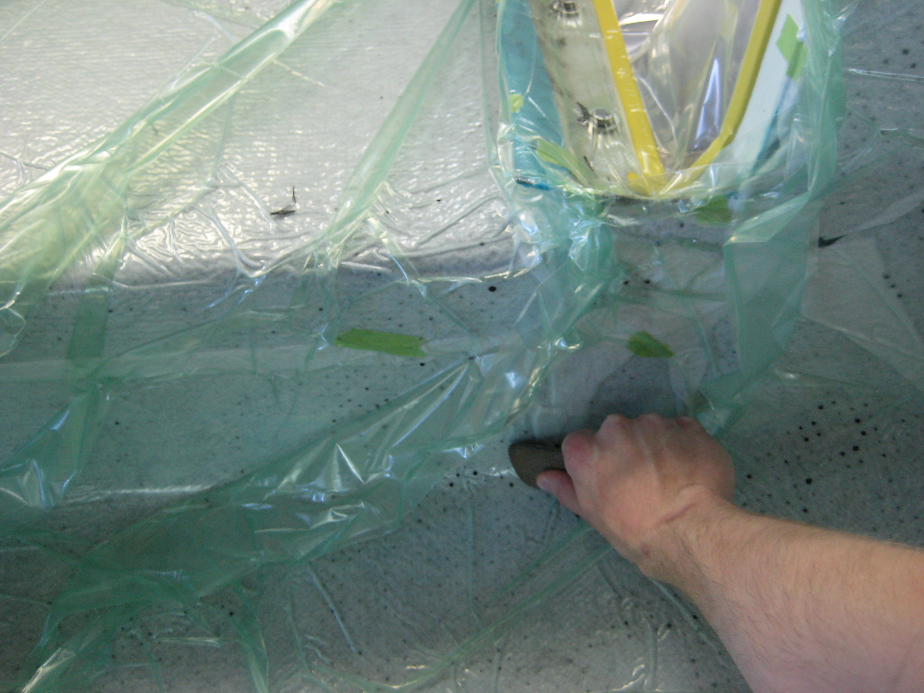 The bag will begin to lose its volume as air is removed from the system.  As this happens, the bag must be pushed into any deep pockets in the mold to prevent areas where the bag does not compress flat against the bleeder sheet–to do this the part is “sticked” in order to force the bag into the corners, fillets, and pockets of the mold (being careful not to puncture the bag!).  A rectangular stick with well-rounded edges enables this: