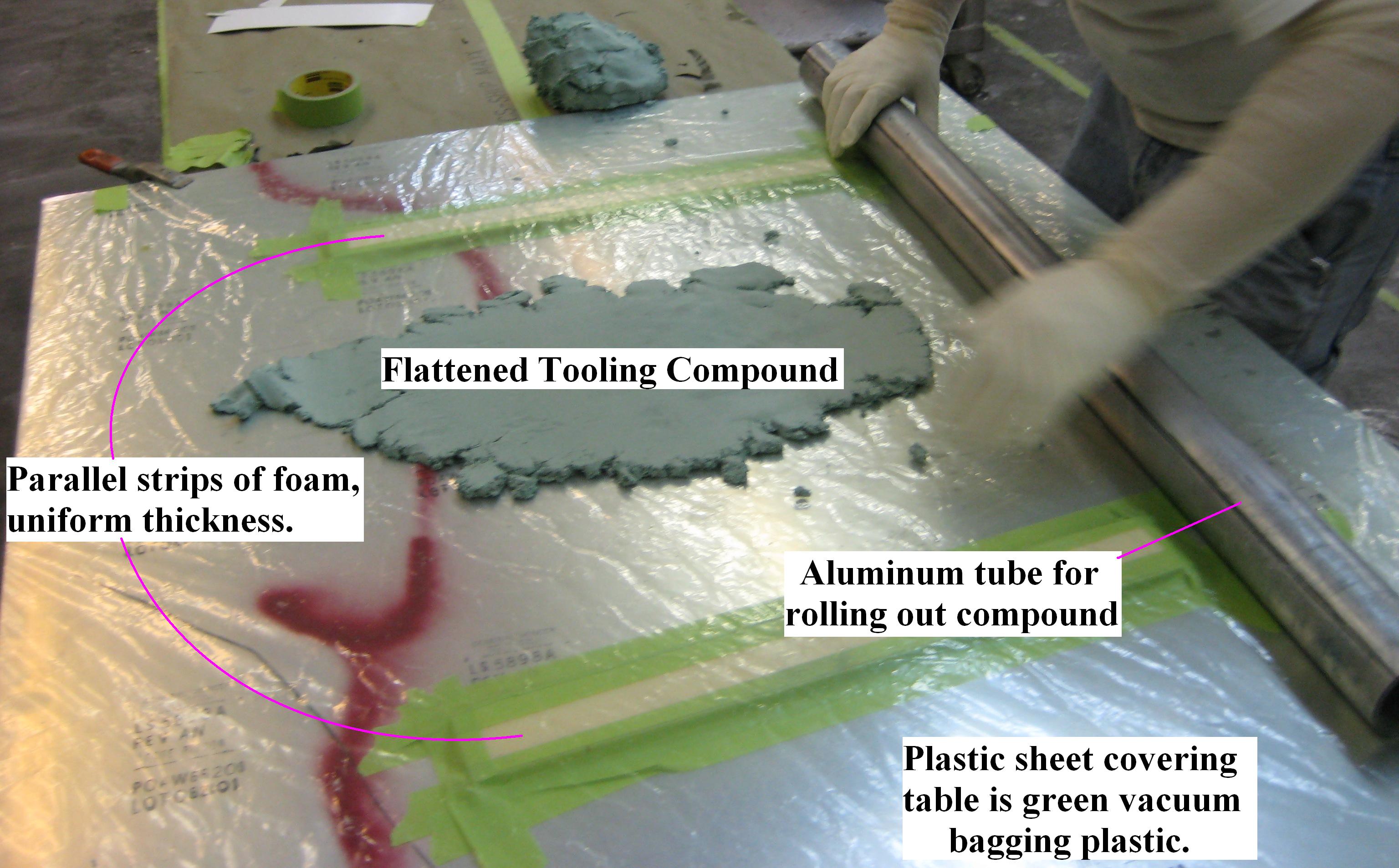 While the tooling compound is mixed, another employee should prepare the tooling compound “rolling table.”  This is basically formed by taping parallel strips of 1/8″ foam core onto a table, and covering them over with the green plastic vacuum bagging material (which the tooling compound will not stick to)…  This creates an area where the compound can be rolled into flat sheets of uniform thickness with parallel surfaces–similar to rolling out cookie dough, but more precise: