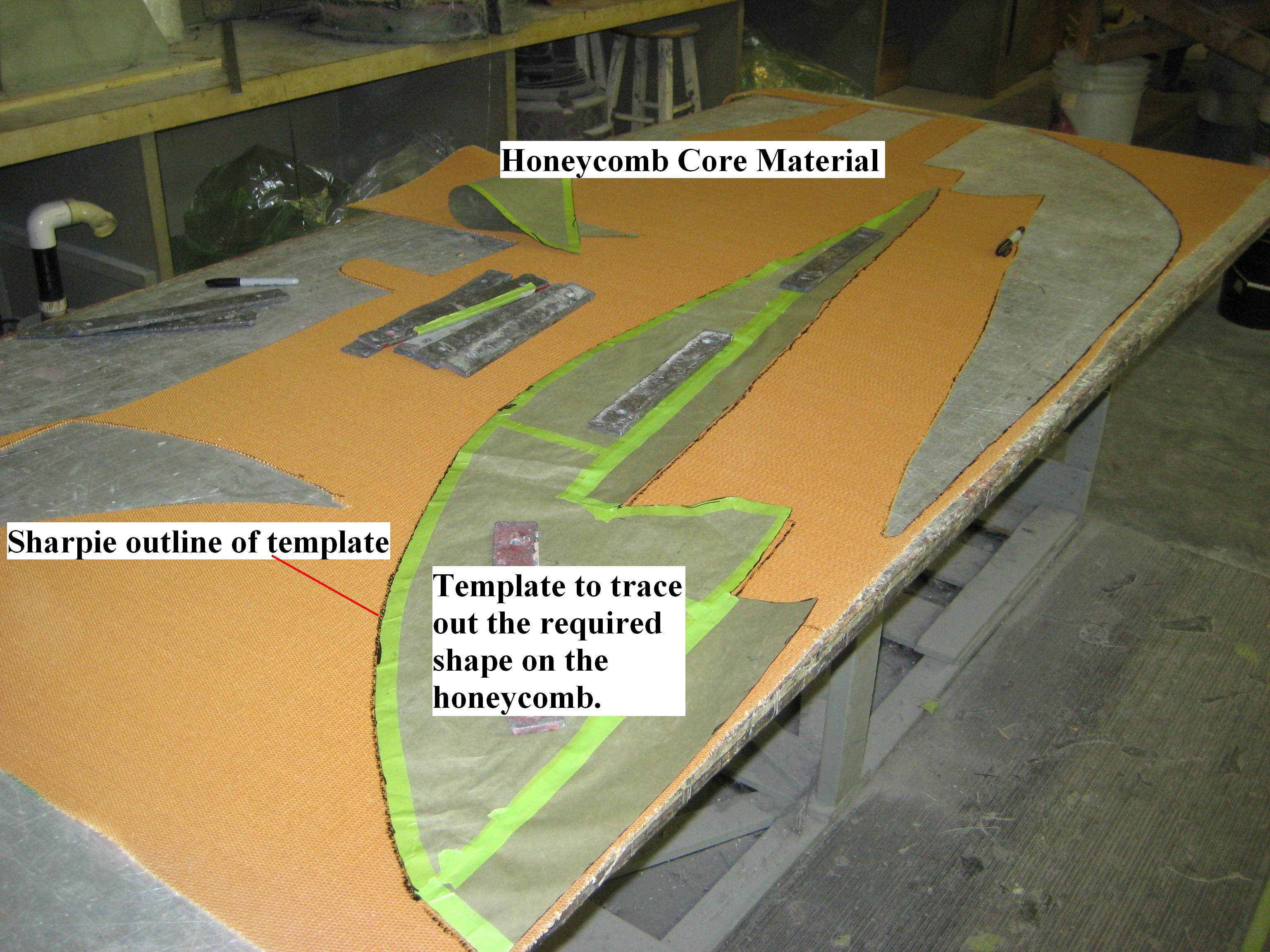 So, honeycomb and foam cores need to be prepared and set aside for layup later.  These cores are traced out (with a Sharpie) to the dimensions specified by templates which correspond to the shape of the fender itself.  The core is cut out using a utility knife.