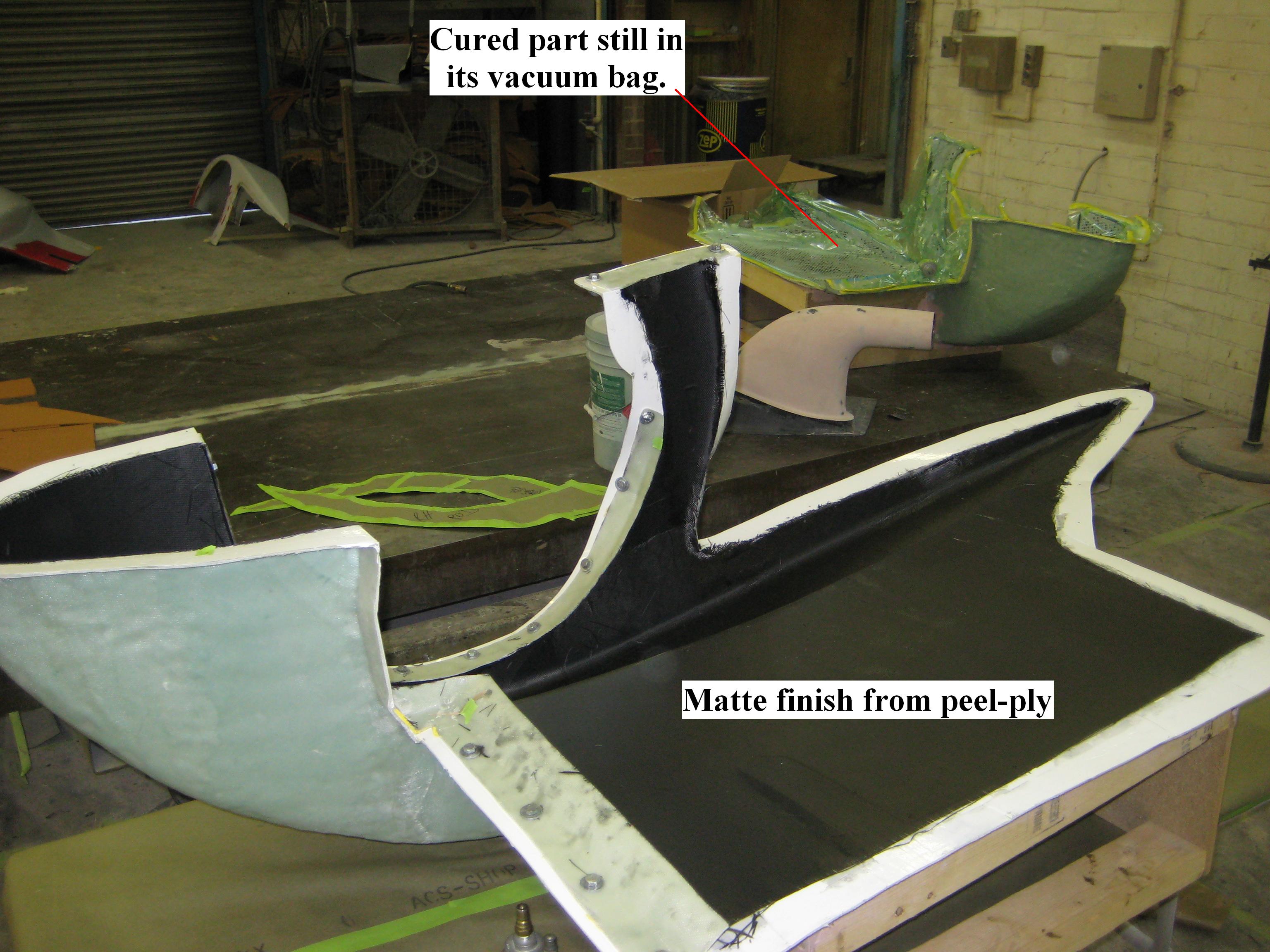 What is peel-ply?  When carbon fiber is wetted out with epoxy and the epoxy is allowed to cure, the surface will take on a very shiny, smooth texture if it is just left exposed to the air.  This shiny surface can actually be a hassle when a composite manufacturer wants to bond something to it…  The shiny, smooth surface will have to be roughened up with sandpaper before something can be successfully bonded to it.  Peel-ply saves you that headache.  By applying peel-ply to the wetted out carbon fiber surface before it cures, the a smooth, shiny surface is prevented from occurring during the cure process.  The peel-ply is microscopically rough and porous, and after the curing process is completed it can be pulled off of the cured carbon/epoxy surface to reveal a matte finish, not a shiny finish.  The matter finish is microscopically rough, just as the peel-ply is.  This rough impression left in the epoxy by the peel-ply enables a composite manufacturer to bond something to it immediately with more epoxy.  As a contrast between the “shiny” and “matte” surfaces which results from not using peel ply / using peel-ply, look at this close-up image of one edge of an oil cooler air scoop: