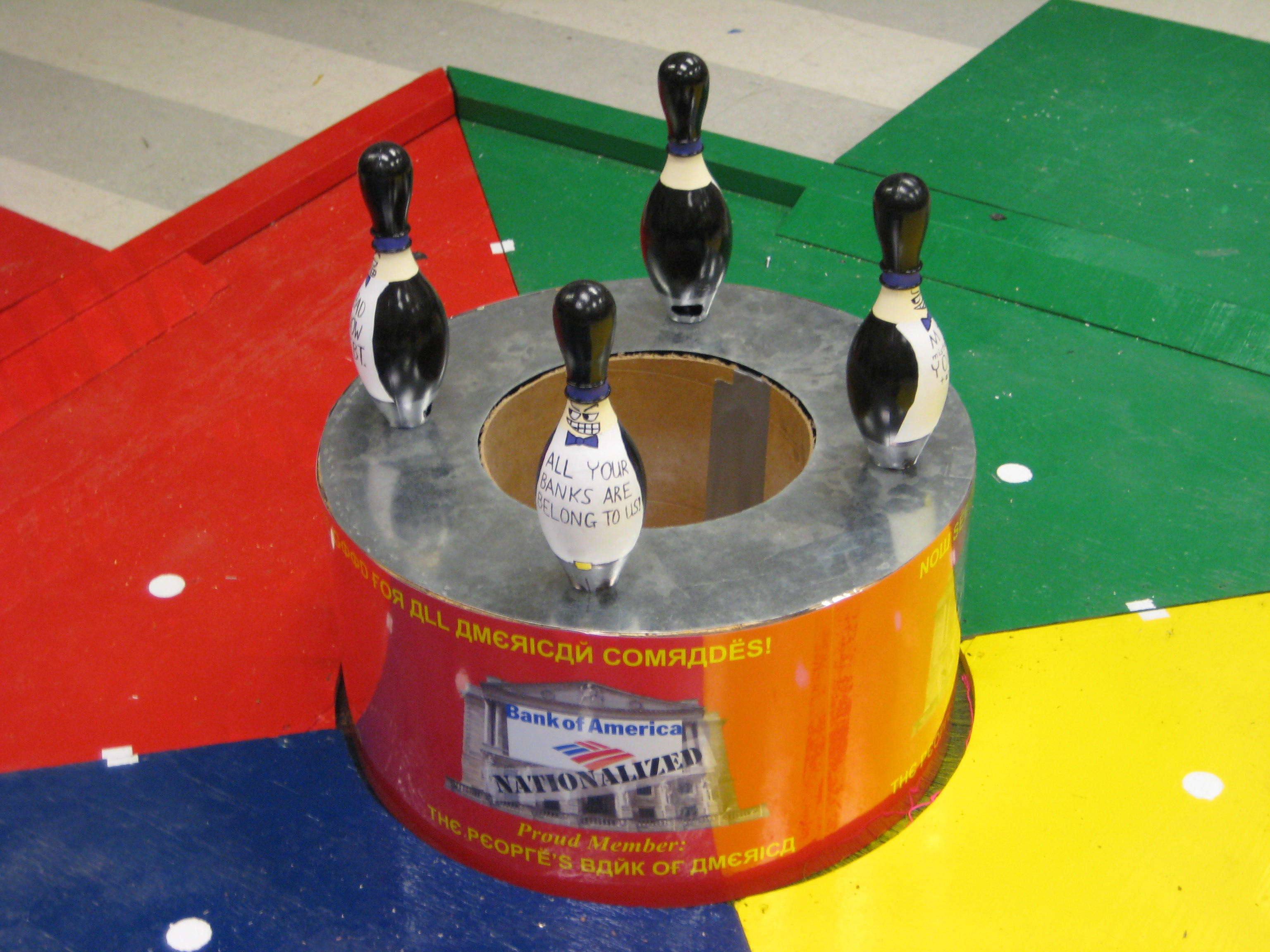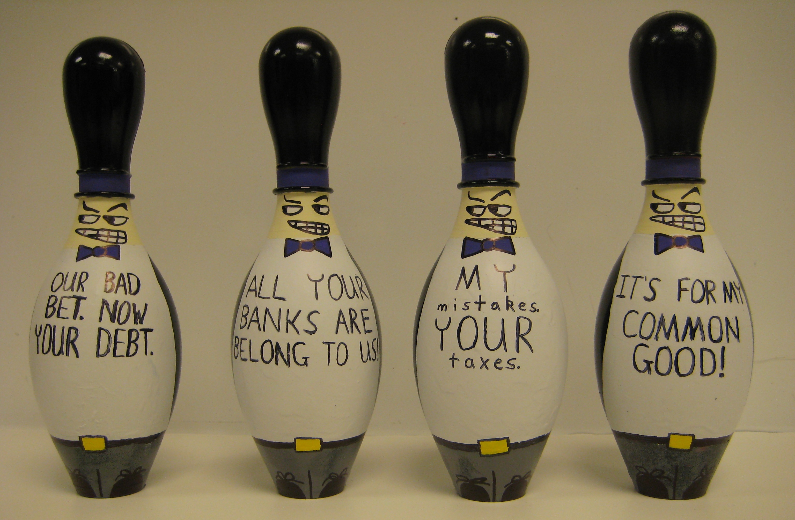 I originally had planned on printing out faces of various officials and CEO’s who have been involved in this ‘swindle,’ but rejected this idea for the reason that an image printed on paper would not conform well to a bowling pin with a circular cross section, and would not look very professional. I decided to just paint a shady-looking face on the pin. Acrylic and spray paints were used to make these, and face outlines, lettering, and pants/shoes were done in black sharpie marker on top of the paint itself. The pins themselves had ridges around the neck of the pin, and I thought these would serve nicely as the brim of a top-hat on the swindler’s head. I also gave the swindler a very large white chest on which I painted a short phrase summarizing the swindle. Since there were four swindlers on top of each bank, I made four phrases to put on the pins. ‘All Your Banks are Belong to Us!’ of course refers to the popular internet meme (I plan on making an ‘All Your Banks’ video in the near future as some good practice with my new copy of Photoshop Elements 6. Sure, you can rip my idea off, but my video will be so superior in creativity that your video will have no chance to survive make your time).