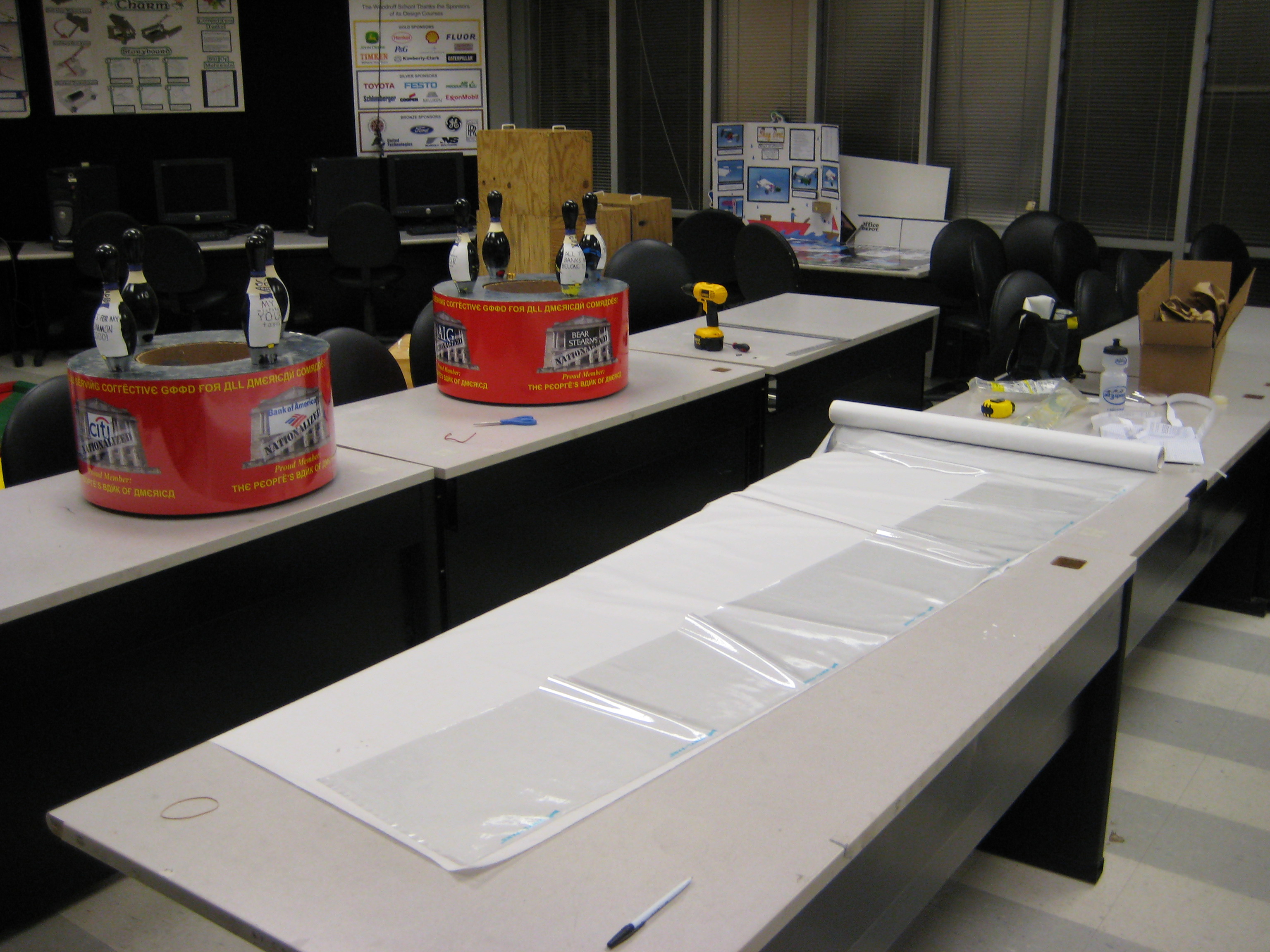 The powerpoint slides, printed out on a plotter on the campus of Georgia Tech, were taped to the bank with clear packing tape. I then covered them with a clear protective film of 0.008″ thick PVC type I ordered from Mcmaster-Carr. This protected them from all the machines which would be running into them throughout the competition. Under construction: