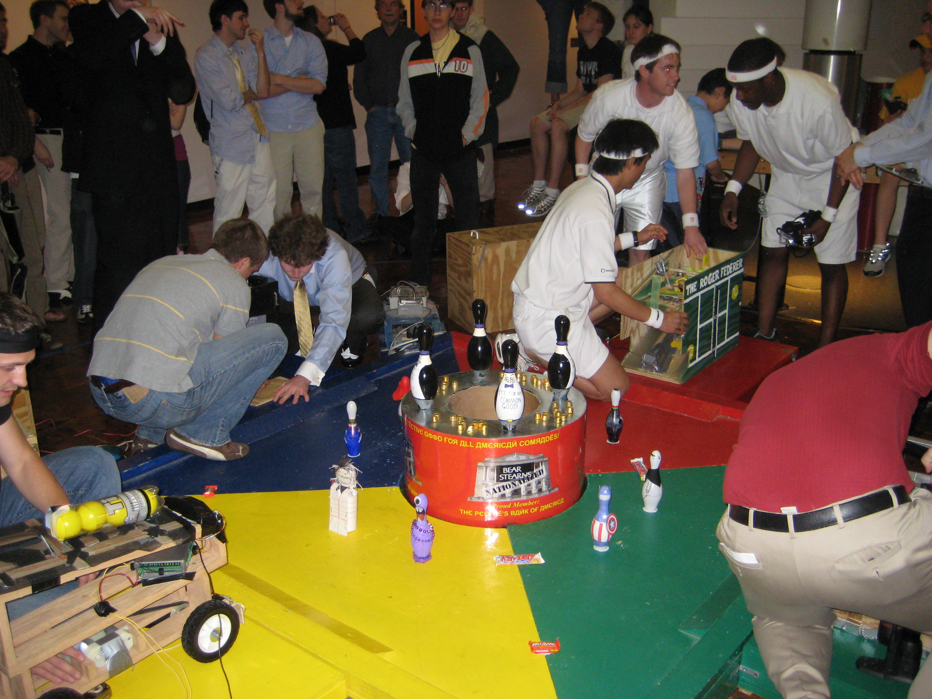 - Deposit “salary balls” into the “bank” at the center of the arena. The bank is a two foot diameter, one foot high drum with a one foot hole in the middle of its top. The bank is rotating, and there are four “swindler” bowling pins affixed to the rim of the bank. Thus, their machines–to be reliably successful at performing the ball depositing task–must ‘avoid the swindlers which are trying to steal their salary.’
