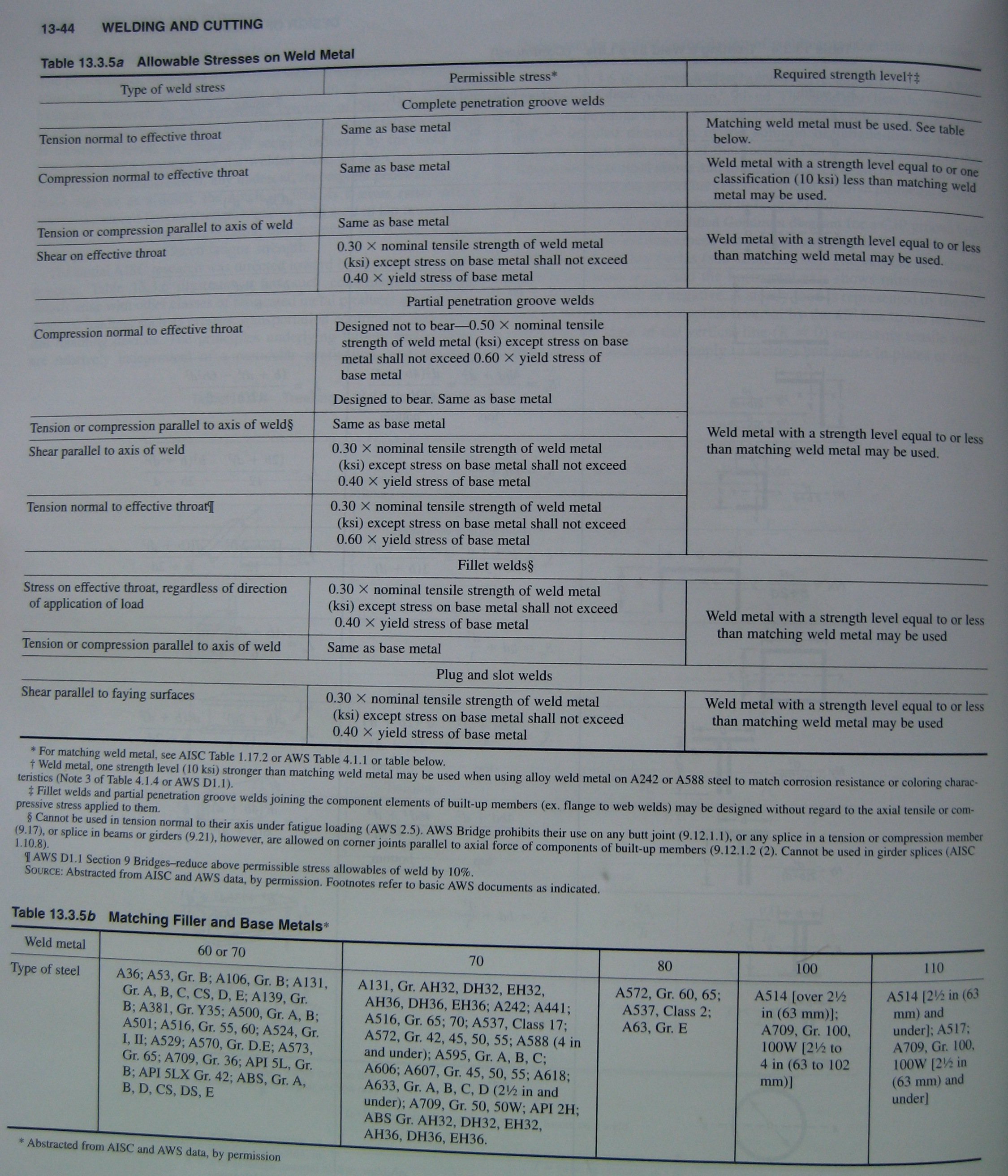 As mentioned earlier, allowable weld strengths in fatigue for many common welds are specified by the AWS and the AISC (for steel). AISC research was directed towards bridge construction and focused on weld shapes common to that industry with steel being the material of interest. The information presented below is a small part of an extensive AISC tabulation in “Manual of Steel Construction, 9th Ed”: