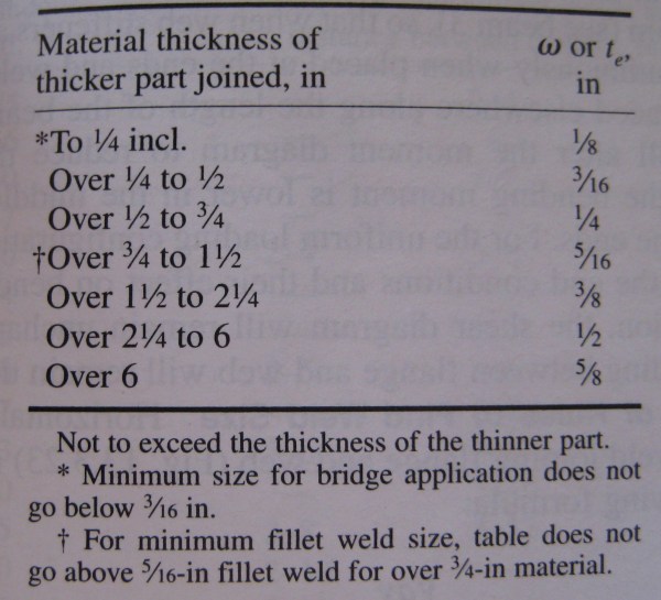 “Table J2.4 provides the minimum size of a fillet weld for a given thickness of the thinner part joined. The requirements are not based on strength considerations, but on the quench effect of thick material on small welds. Very rapid cooling of weld metal may result in a loss of ductility. Further-more, the restraint to weld metal shrinkage provided by thick material may result in weld cracking.”
