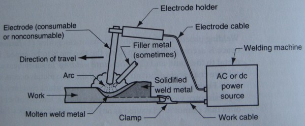 In arc welding, the material is fused through the heat of an electric arc at the work surface, stemming from an electrode held by the operator. The arc is initiated by bringing the electrode into contact with the work and then drawing it away from the surface; temperature generated can be 5500 degrees C (10,000 degrees F), sufficiently hot to melt any metal [1]. The workpiece, cables, and welding machine form a circuit which is closed by the arc spanning the distance between the workpiece and the electrode. The general configuration of an arc welding equipment setup is shown below.