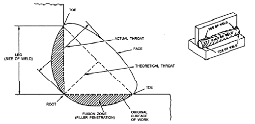 When comparing the stress in a weld of interest to the allowable stresses established by the AWS or AISC, the stress is computed on the weld’s throat. For a fillet weld, this “theoretical throat” is indicated in this diagram: