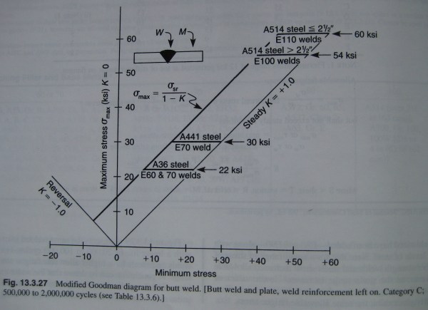 By selecting the appropriate weld geometry (the upper part of table, with the part diagrams), and then an appropriate range of cycles or the appropriate stress range (depending on what the engineer is attempting to solve for, or knows about the service life) in the lower table, then Goodman diagrams for specific: A) steels and filler material B) weld geometries and C) number of cycles are then used to ensure failure will not occur:
