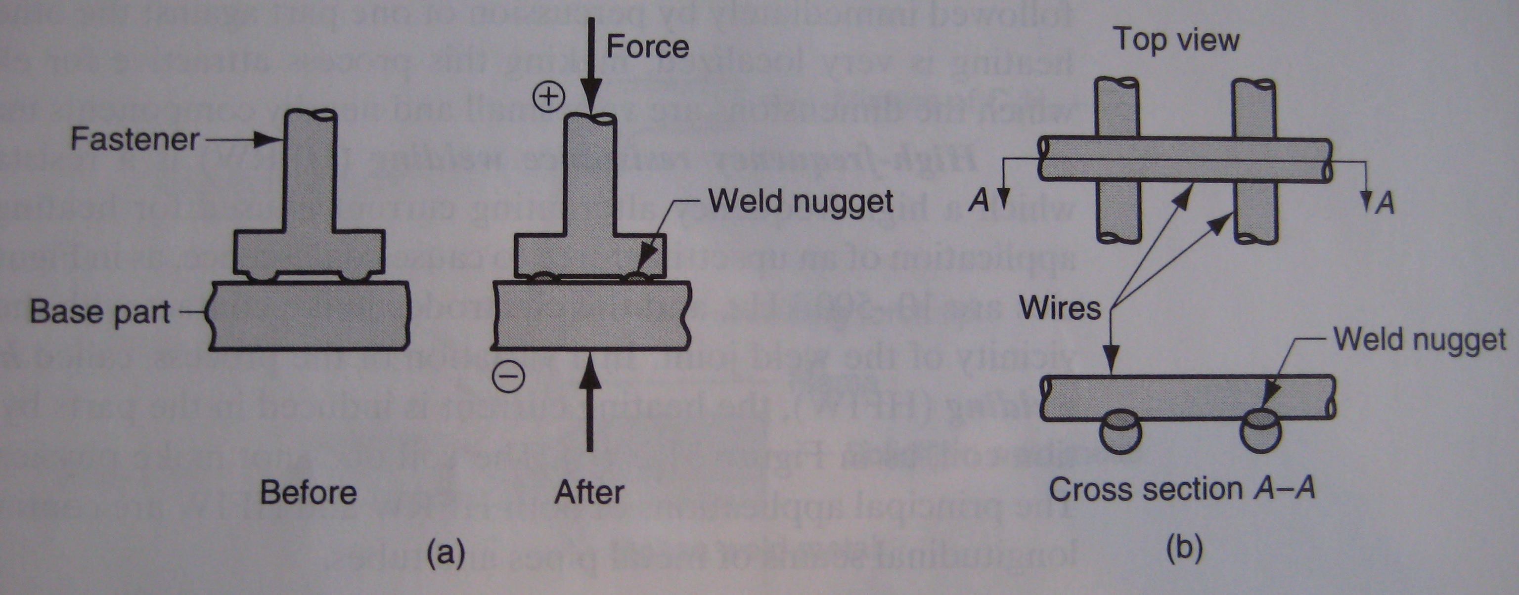 - High Frequency Resistance Welding: high frequency AC is used to heat the parts, followed by an upsetting force, which merges the parts. Frequencies are in the range of 10-500 kHz and the electrodes are in contact with the work near where the weld is performed.