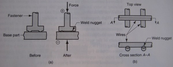 - Cross-wire welding, illustrated in (b) of the image above, is commonly used to make wire fencing, shopping carts, and stove grills.