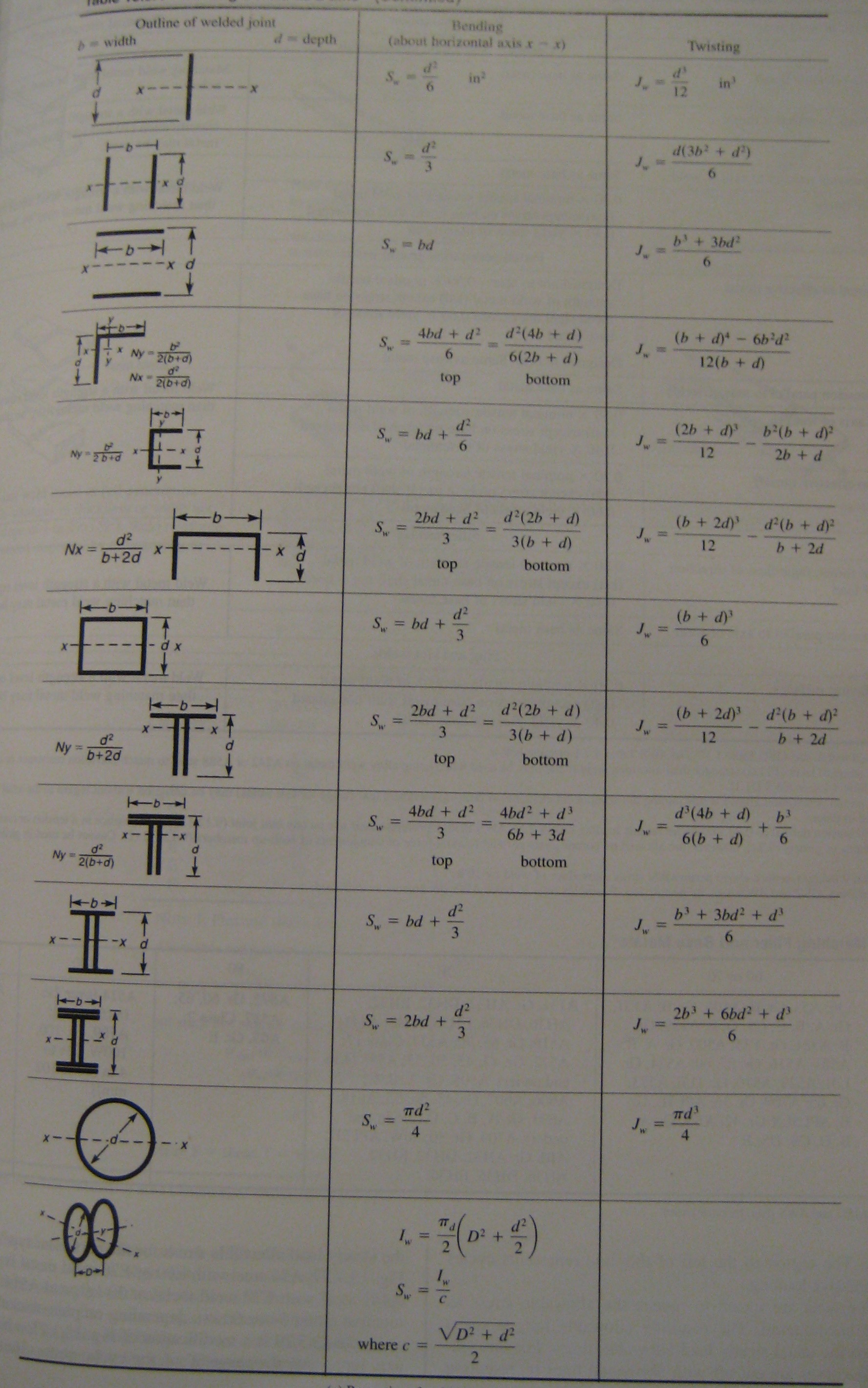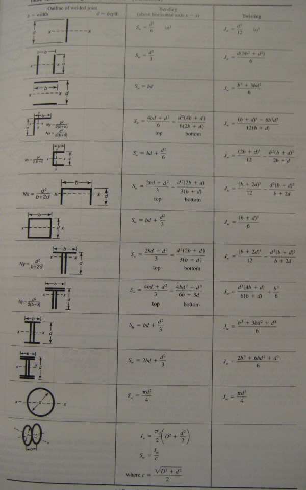 This table shows how regarding the weld as a line can then be translated into calculating section modulus and moment of inertia for some common weld outlines [8]: