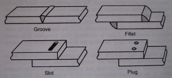 There are four main types of welds: groove, fillet, slot, and plug. By themselves, fillet welds do not fully fuse the cross-sectional areas of the parts they join, though with a sufficiently sized weld it is still possible to achieve a full-strength connection. Slot and plug are only used for connections that transfer small loads [8].