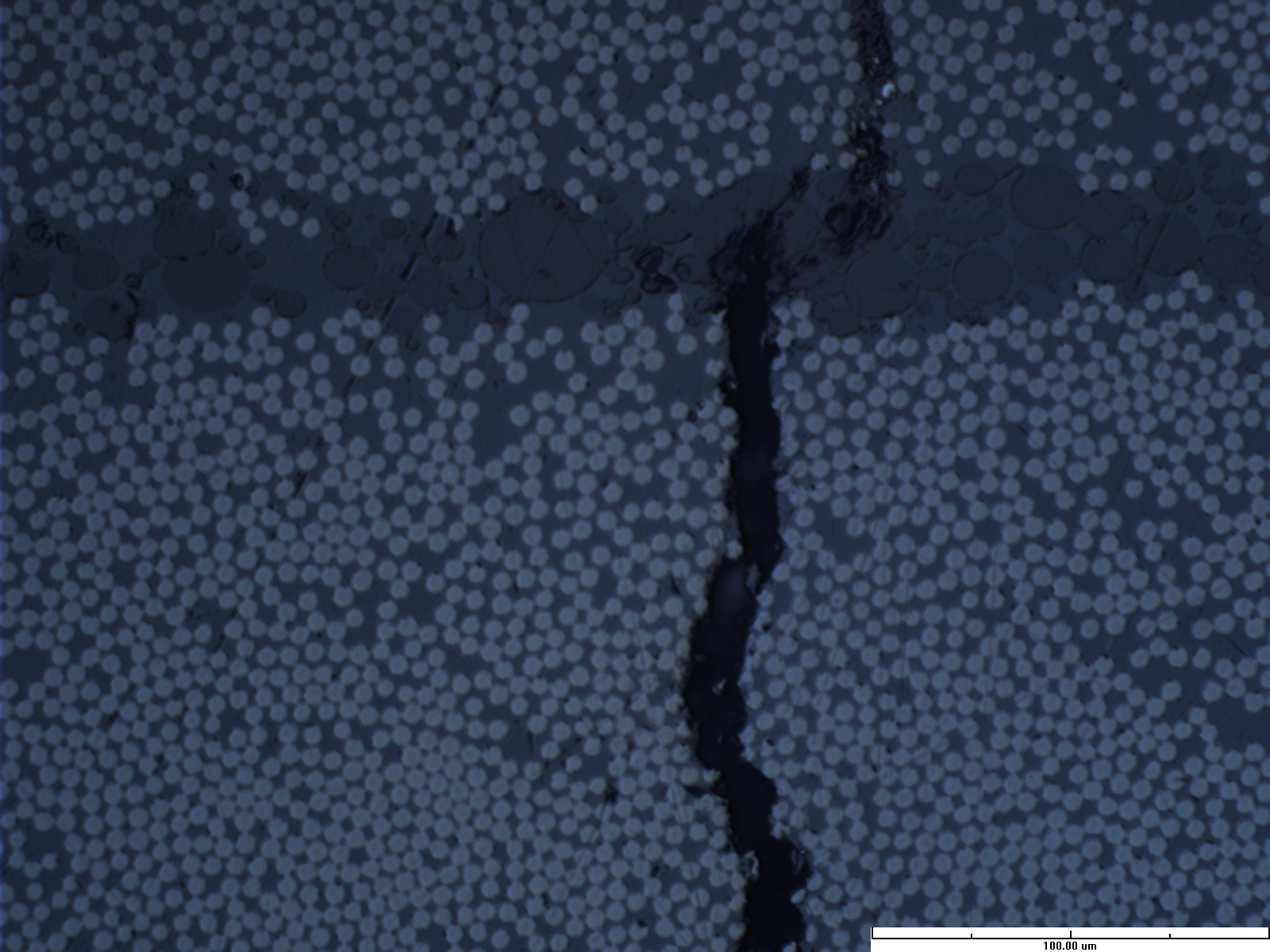 The horizontal bands in the image above are the individual carbon fiber laminas: there are ten 90 degree laminas in the middle of this layup with a 0 degree lamina on the “top” and “bottom” of the layup. The thickness of that 12 ply layup is 0.093″. Below is a further magnified view of the 90 degree plies–the circles in the image are the cross-sectional tips of the carbon fibers, which are embedded in the surrounding epoxy matrix: